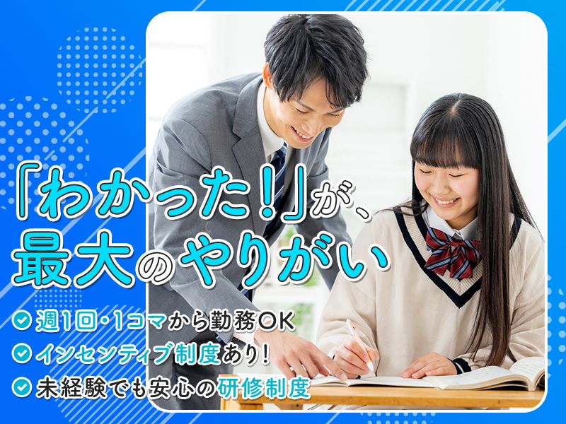 仕事内容 *************** 子どもや教育に関心がある方歓迎! 子どもたちと一緒に、 成長を実感できる仕事です! *************** <求人のPOINT> ✅週1回勤務、1コマ~OK! ✅インセンティブ制度あり ✅残業ほぼなし! <仕事内容> 個別指導塾での 塾講師業務をお願いします 〇指導対象:小・中・高校生 →1コマにつき最大2名を担当 〇指導科目:英語・数学・国語ほか →1教科からOK