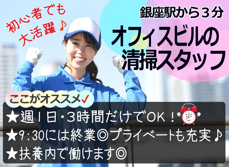 仕事内容 銀座のオフィスビルのお掃除をお任せします。 拭き掃除や掃き掃除、 トイレ清掃など (※女子トイレ清掃あり) シンプル・簡単な作業ですので、 未経験でもご安心ください♪ 研修後は1人作業がほとんどですので、 職場では最低限のコミュニケーションで済ませたいという方、黙々と働きたい、という方にはピッタリのお仕事です! ・未経験でもできる仕事がいい ・短時間でできる仕事を探している ・扶養範囲内で勤務したい方 ・Wワーク(掛け持ち)しながら働きたい方 ・ルーティンワークとして働きたい方 基本シフトは 「週1日」&「1日3時間」 サクッと短時間で働けます♪(残業なし) 長期で働きたい方にもオススメです!