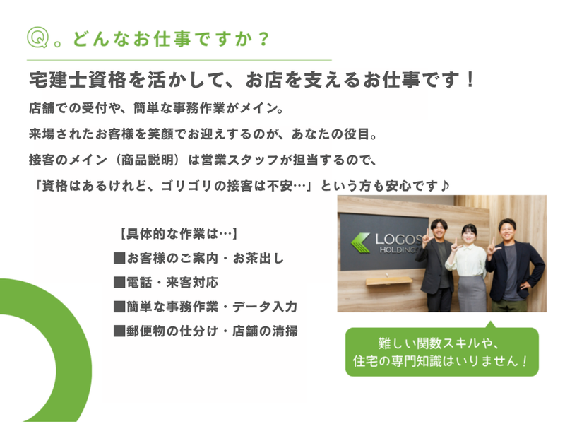 仕事内容 ✨週3日~OK、土日休みも相談可能 ✨宅建士資格を活かせる ✨副業・兼業も可能 ✅仕事内容  ̄ ̄ ̄ ̄ ̄ ̄ ̄ ̄ ̄ ̄ ̄ ̄ ̄ ̄ 店舗で宅建士資格をお持ちの 事務スタッフを募集しています。 【具体的な仕事内容】 ・来客対応、お茶出し ・電話対応 ・清掃 ・郵便物の仕分け ・簡単な事務作業 など… 【業務の特徴について】 来場予約をいただいたお客様の お席へのご案内やお茶出しが メインとなります。 商品のご説明などは営業担当が 行いますので、接客が苦手な方でも 安心して取り組んでいただけます。 ✅宅建士資格を活かせる  ̄ ̄ ̄ ̄ ̄ ̄ ̄ ̄ ̄ ̄ ̄ ̄ ̄ ̄ お持ちの宅建士資格を活かして 働いていただけます。 ✅柔軟な働き方が可能  ̄ ̄ ̄ ̄ ̄ ̄ ̄ ̄ ̄ ̄ ̄ ̄ ̄ ̄ 週3日からの勤務が可能で、 土日休みもご相談いただけます。 勤務時間や出社時間も調整可能 ですので、ライフスタイルに合わせて 無理なく働けます。 ✅当社について  ̄ ̄ ̄ ̄ ̄ ̄ ̄ ̄ ̄ ̄ ̄ ̄ ̄ ̄ 株式会社ロゴスホームは 2003年設立の住宅会社です。 新築住宅の販売・設計・建設・リフォーム を手がけており、急成長中の企業です。 一人に任せず仲間と協力する 家づくり・営業を行っています。