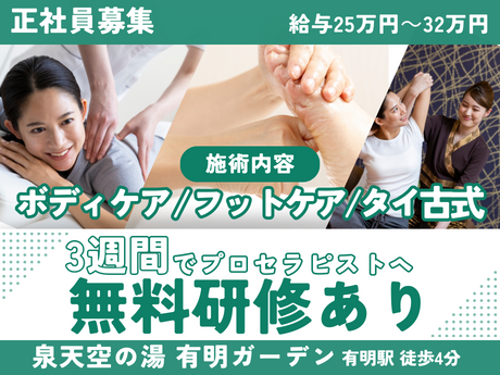 応募資格 ・未経験者歓迎(無料研修制度有り) ・経験者優遇 ・学歴・年齢不問、第二新卒OK <<下記のような方大歓迎です>> ★本気で学び、本物の技術を習得し、長きにわたりしっかり稼ぎたい方 ★一流のセラピストを目指したい方 ★自分だけでなく、家族・友人も幸せにしたい方 ★健康、癒し、美容に興味のある方 ★ポジティブで向上心のある方 ★未経験、ブランク有でもOK ★目標に向かって努力のできる方 ★エステティシャンの経験がある方 ★あん摩マッサージ師、柔道整復師、鍼灸師の経験がある方 ★子育てや介護しながらでも働きがいある仕事がしたい方 ★海外で本格的に活躍したい方 ⇒グループの海外店舗で飛躍! ※美容師、保育士、介護福祉士、アパレル、理学療法士、エステティシャンなど セカンドライフでやりがいを求めて転職された方々が生き生きと活躍中! 未経験者歓迎/経験者優遇/フリーター歓迎/主婦(夫)歓迎/学歴不問/髪型自由/友達と応募歓迎