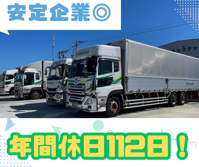 仕事内容 ✅50年以上の歴史を持つ安定企業! ✅高待遇!各種手当も充実! ✅大型経験者でトレーラーにステップアップしたい方、必見! ✅昇給・賞与・退職金制度あり! ✅日祝+他のシフト制でお休みしっかり◎ ✅車・バイク通勤OK!無料駐車場完備! 【仕事内容】 トレーラーを牽引し、貨物船へのシャーシの積み下ろしと指定場所への配送をお願いします。 困ったことがあればスグに聞いてくださいね! サポート体制は万全なので、ブランクがある方もご安心ください♪ ◆扱う製品は主に空瓶、農業資材関係、プラスチック製品、飲料、製材。その他一般貨物になります。 <配送エリア> 九州管内 ※運行スケジュールにより早朝・深夜発の場合あり 走るコースは50km程度の超近距離から180km~400km程度の中距離まで様々! どの配送先も日帰りの範囲内なので、日々無理のないスケジュールで運行しています◎ ⏰ 1日の流れ(日勤の例) ⏰ 8:30 出勤・出発【前日宵積み分の配送】 10:00 営業所に戻る 積み込み 10:30 出発【当日分の配送】 13:00 営業所に戻る・昼食 14:00 次の日積み込み分の宵積み 16:00 宵積み終了 16:30 事務作業 17:30 退勤 おつかれさまでした! \\✨スタッフにインタビュー✨// ▼40代男性:入社3年目(トレーラー未経験) 元々車の運転が好きで、ブランクはありますが大型トラック運転の経験者だったのでこの機会にトレーラーに挑戦してみました。 日本の物流を支えるという社会的な責任感と、無事に荷物を届け終えた時の達成感は、この仕事ならではの大きなやりがいだと感じています! 大型ドライバーは長距離ばかりで家に帰れないイメージがあるかもしれませんが、当社はどのコースでも日帰りなので、毎日家に帰って家族との時間もしっかり確保できるのが嬉しいですね。 おかげさまでワークライフバランスも良く、趣味の時間などプライベートも充実できています! 入社当初は未経験で不安もありましたが、先輩方の丁寧な指導と会社のサポート体制が手厚くて長期的に安心して働ける環境だとすぐに実感しました。 私のように、仕事と家庭を両立させながら安定収入を実現させたい方にピッタリの職場だと思います! ■――――― 当社のHPはこちら! ▶http://www.shinkuma.co.jp/ ―――――■