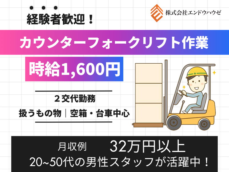 仕事内容 ★アピールポイント★ ・今までの資格や経験が活かせます ・安定して長期で稼ぎたい方大歓迎 ・ 土日休みでプライベートととも両立できます ・ あつかう物が製品ではないので、安心して運搬できます 20代~50代の男性が活躍されている明るい職場です 事前に工場見学できますので、気軽にご応募ください! ★仕事内容★ 大手自動車メーカーの部品を保管・出荷する倉庫にて、以下の業務をお任せします。 ・空き台車や空き箱の運搬(カウンターフォーク使用) ・出荷前の台車整理・片付け ・フォークリフトでの部品台車の搬送・整列 など ※扱うのは製品ではなく、空箱や台車が中心。フォーク作業に集中できます。 また戻ってきた台車と箱を片付ける作業もあります