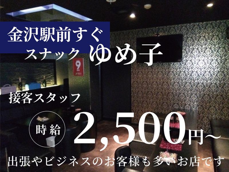 仕事内容 「スナックゆめ子」のフロアレディとして、お客様との会話やカラオケを楽しんでいただくお仕事です。 金沢駅前すぐ、徒歩5分の好立地にあり、出張で金沢を訪れるビジネスマンのお客様も多くご来店されるお店です。 店内はラウンジを思わせる落ち着いた空間で、リラックスしながら働ける雰囲気が魅力の一つです。 無理にお酒を飲む必要はありませんので、体に負担にならない程度で、自分のペースを大切にしながら働けます。 未経験の方でも安心してスタートできるよう、ママや先輩スタッフがしっかりサポートします。 ―――――――――― ◆ 働いているスタッフについて 20歳以上〜30歳前半の方が中心で、大学2年生・3年生・4年生の学生さんも活躍しています。 学業と両立しながら働いている方も多く、それぞれのライフスタイルに合わせて無理なく続けられる職場です。 ―――――――――― ◆ 働きやすさ抜群! 未経験の方、子育て中の方、学生、Wワーク希望の方も大歓迎! シフトは週1日からOKで、1日2~3時間の短時間勤務も可能です。短期・長期どちらも歓迎しています。 *Wワークのスタッフも多く、本業や学校に支障の出ない範囲で働いていただけます。 また、給与は日払いにも対応しているため、すぐに収入を得たい方にもおすすめです。 ―――――――――― ◆ 好待遇でお迎えします! 時給は2,500円からスタートし、経験や能力次第でさらに優遇します。 頑張り次第で、しっかりと高収入を目指せる環境です。 ―――――――――― ◆ あなたらしく働ける場所 「人と話すのが好き」「人の話を聞くのが得意」そんな方にぴったりのお仕事です。 未経験の方でも安心して働けるよう、サポート体制を整えていますので、新しいことにチャレンジしたい方も大歓迎です。 あなたの笑顔とおもてなしの心が、きっとお客様に喜ばれます。 ―――――――――― ◆ 応募について まずは1日体験からスタート! ☆ 1日体験(4時間、10,000円~) もちろん、不安な方・初めての方は見学からでもOK! お友達同士での応募も大歓迎です!