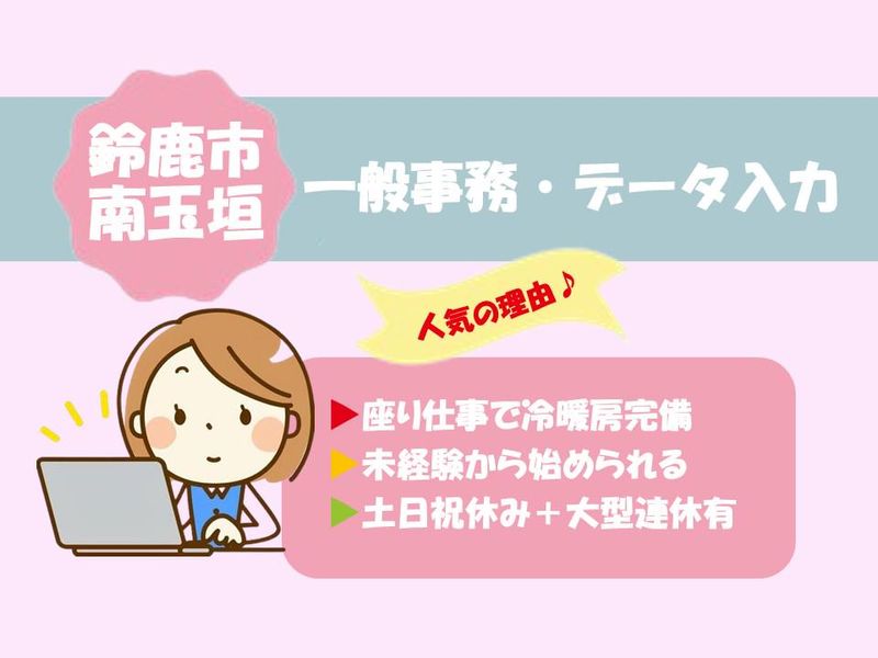 仕事内容 +:..。o○☆・:,。+:..。o○☆+:・:,。 土日祝休み&大型連休あり!プライベート充実 ネイル・髪型自由!オシャレを我慢しない 基本定時で働ける!残業少なめ安定ワーク +:..。o○☆・:,。+:..。o○☆+:・:,。 具体的なお仕事内容 <一般事務および窓口対応業務> ✅ 決まったデータをシステムへ入力する作業。 ✅難しいスキルや経験は必要ありません。 ✅ お客様からの電話対応(受電中心を想定)。 ✅ 窓口での来客対応や窓口業務。 ✅ 社内/社外とのメールのやり取り。 <安心の体制> ✅ PCの基本操作ができれば大丈夫です! ✅ 先輩が丁寧に教えてくれるので、初めての事務職でも安心です。 ✅ 時間に追われることなく、落ち着いて働ける環境です。 アピールポイント <待遇・休日> ✨ 土日祝休みに加え、大型連休もあります。 ✨ 基本定時で働けます!残業は少なめ。 ✨ 長期で安定して働けるお仕事です。 <環境・経験> ✅ ネイル、髪型自由!自分らしく働けます。 ✅ 経験問いません!未経験から始められます。 おすすめポイント <こんな方に特におすすめ!> ⭐ 土日祝休みのオフィスワークを探している方。 ⭐ 残業をせず、プライベートや定時後の予定を大切にしたい方。 ⭐ ネイルや髪型など、オシャレを諦めたくない方。 ⭐ 未経験から事務職にチャレンジしたい方。 職場環境 <教育・サポート> ✅ 先輩が近くでしっかりサポートしてくれるので、安心してスタートできます。 <その他> ⭐ 勤務期間は長期を想定しています。 ⭐ まずはお気軽にお問い合わせください!