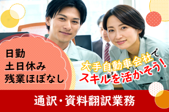 仕事内容 通訳・翻訳業務【LRT通勤歓迎】大手自動車研究所内でのお仕事パソコンスキルと通訳翻訳スキル…是非とも活かしてください!≪土日休◎長期休暇有◎残業少なめ≫ <仕事内容> ◇通訳・翻訳業務 ◇大手自動車会社内での通訳のお仕事です!! 通訳&資料翻訳業務(外国語⇒日本語、日本語⇒外国語)、簡単な庶務業務お任せします! 大手で働くチャンス見逃さないで下さい! その他多数、事務業務求人あります!是非、一度面談にお越しください!! 座り作業です。 《職場環境》 女性が多い職場* CDP派遣スタッフ在籍中☆ 冷暖房完備♪一年中快適な環境で業務に取り組んでいただけます。 ロッカー有り|休憩室完備|売店有り|ATM有り|診療所有り アピールポイント <仕事内容> ◇通訳・翻訳業務 ◇大手自動車会社内での通訳のお仕事です!! 通訳&資料翻訳業務(外国語⇒日本語、日本語⇒外国語)、簡単な庶務業務お任せします! 大手で働くチャンス見逃さないで下さい! その他多数、事務業務求人あります!是非、一度面談にお越しください!! 座り作業です。 《職場環境》 女性が多い職場* CDP派遣スタッフ在籍中☆ 冷暖房完備♪一年中快適な環境で業務に取り組んでいただけます。 ロッカー有り|休憩室完備|売店有り|ATM有り|診療所有り \充実した福利厚生/ ◎社会保険・雇用保険完備 ◎有給休暇有(6ヶ月経過後、10日付与)※規定あり ◎残業手当 ◎交通費支給(規定内) ◎確定拠出年金制度 ◎週払い制度(週3回対応) ◎お友達推薦制度あり(規定有り) ※1名につき3万円~10万円臨時給与として支給 ◎職場見学あり ◎車(マイカー)・バイク通勤可(無料駐車場あり) ◎制服貸与 ◎冷暖房完備 ◎食事持参可 ◎社員食堂あり(1食500円程度) ◎ロッカー・休憩室利用可 ◎売店・ATM有り ◎福利厚生プログラム (宿泊、グルメ、ショッピングなど大幅割引が受けられる10万アイテムのメニューがあります。)