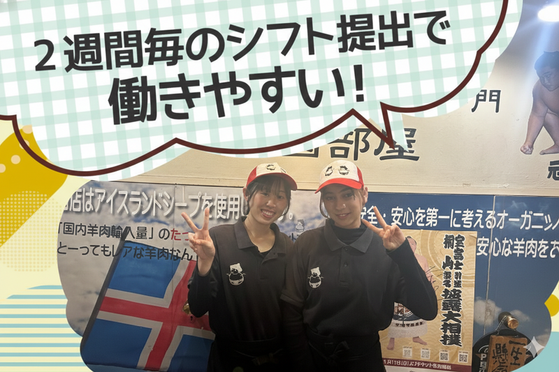 仕事内容 / 22時以降は時給2000円も可能★ 活気あふれるジンギスカン専門店で ホールスタッフを募集します! \ ・学生&フリーター活躍中/同年代多数! ・チームワーク抜群&店長も超優しい♪ ・絶品まかないが食べ放題! ・バイトデビュー歓迎! ★お仕事内容  ̄V ̄ ̄ ̄ ̄ ̄ ̄ ̄ ̄ ̄ ̄ ̄ ̄ ̄ ̄ ̄ ̄ ̄ ホール業務をメインにお任せします♪ 具体的には… ■案内 ■提供 ■会計 ■電話対応 ■開店前準備(店内清掃・配膳・洗濯) ■食材仕込み・お弁当準備 など… 最初はできることからでOK。 慣れるまでは先輩が横について教えます。 ★アピールポイント  ̄V ̄ ̄ ̄ ̄ ̄ ̄ ̄ ̄ ̄ ̄ ̄ ̄ ̄ ̄ ̄ ̄ ̄ ⭐最大時給1600円! 22時以降は時給25%UP! 評価制度があるので、 頑張り次第で昇給も目指せます◎ ⭐AWARD選抜でしっかり評価 毎月AWARD選抜を実施! 選ばれたスタッフには QUOカード2,000円分プレゼント♪ 頑張りがきちんと評価されます! ⭐スタッフ想いの嬉しいイベントあり! クリスマスにはケーキの差し入れも♪ 年内最終営業日の後には、皆で焼肉パーティー! 送別会/決起会などイベント多数で仲良くなれる! ⭐営業中はメリハリ! 営業中は、元気に明るく動く雰囲気です! 忙しい時間帯もチームで協力しながら 楽しく働いています! テキパキ動くのが好きな人や、 にぎやかな職場が好きな人にはピッタリ。 こんな人に向いてます  ̄V ̄ ̄ ̄ ̄ ̄ ̄ ̄ ̄ ̄ ̄ ̄ ̄ ・静かに黙々より、明るい雰囲気の職場がいい ・同年代が多いバイト先で働きたい ・授業・サークルと両立しながら働きたい ・初バイトだけど、しっかり教えてもらえる所がいい 「雰囲気が合いそうかも」と 思ったらぜひご応募ください♪