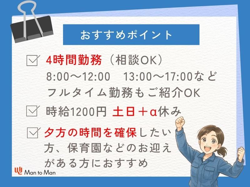 勤務時間・曜日: 【勤務時間】 ・4時間勤務 (相談OK:登録面談時にお教えください) 8:00~12:00 13:00~17:00 など フルタイム(8時間)勤務もご紹介できます♪ ・残業 ほぼなし 月10時間以内程度 【期間】 3ヵ月以上~長期 派遣社員から直接雇用(正社員・契約社員等)の 実績多数あり! Man to Manでは毎年平均10~20名の方が 派遣社員から派遣先の直接雇用に 切り替わっています。