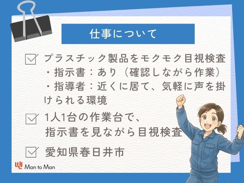 仕事内容: 【職種】 プラスチック製品の目視検査スタッフ 【仕事内容】 自動車のミラーなどに使われる プラスチック製品を作る工場でのお仕事です。 40代、50代、60代も活躍中! 検査で女性活躍中の職場です♪ 【具体的なお仕事は・・・】 プラスチック製品をモクモク目視検査 ・指示書:あり(確認しながら作業) ・指導者:近くに居て、気軽に声を掛けられる環境 1人1台の作業台で、指示書を見ながら 目視検査をしていきます。 例えば、車のサイドミラーを覆う為の 黒いプラスチック製品を手に取って、 1. キズが無いかを確認 2. 決まった個数揃える (例えば、1セット10個だとしたら キズなどを確認→OK、次のものを確認… を10個分やる というイメージです!) 3. 1セット分を箱に詰める という作業を、繰り返していきます。 くり返し作業なので、覚えやすい・慣れやすいです♪ ★スピード感としては、 1個あたり、6~10秒程度で確認して モクモクと取り組んでいくイメージ。 1箱終わった/1段落ついた! というタイミングで、 ・お水を飲む(作業台の足元に置いててOK) ・トイレに行く なども出来るので、モクモク作業に不安がある方もご安心ください♪ ◎未経験の方でも大丈夫! 写真付きの指示書を見ながらの作業です。 分からなくて困った時は、 すぐ近くに職場の正社員さんが居るので 安心して質問・確認できます。 【作業場の環境】 職場は空調設備ありで、 作業台に小さいファンもあるので、 夏でも快適です♪ 匂い等も少なく、働きやすい環境です。 【おすすめポイント】 ■午前/午後のみで終わるお仕事 週4日~1日4時間で扶養内OK! 9時~13時 や 13時~17時 など ※前後30分程度の相談OKです♪ 朝や夕方の時間を確保したい方、 家事をこなす時間が欲しい方、 保育園などのお迎えがある方… そんな方にもオススメです◎ ■髪色自由 現場には、明るい茶髪や金髪 ピンク色の髪の方までいらっしゃいます♪ ・土日+α休み ・就業前に工場見学に行けるので未経験でも安心! ・交通費全額支給! ・給料前払い制度有り! ・WEB、出張面接対応可! お住まい近くの喫茶店/ファミレスで 面接可能です♪ お気軽にご相談ください!