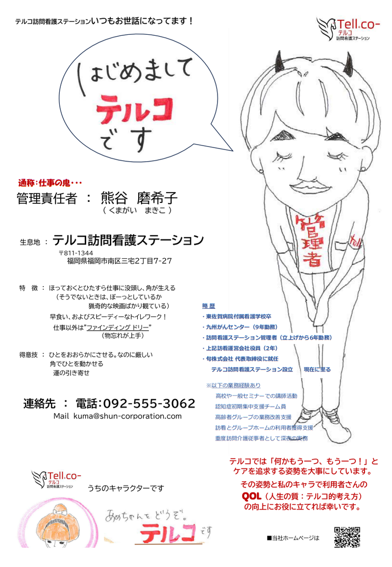 仕事内容 ▶自分の力を発揮して、利用者さんのQOLを高める事 ▶利用者さんを中心に、ケアマネさんや病院の先生たちの仕事をやり易くコーディネートする仕事です♪ ▶訪問看護業務全般をお任せします。 1日4~6件を訪問して頂きます。 <主な業務内容> ◆ご利用者様のバイタルチェック ◆健康相談 ◆外部との連絡調整 ◆レセプト実績入力 ◆その他付随する業務 ▶訪問エリア:福岡市南区近郊(ステーションから車で30分の範囲が中心) *社用車は小型乗用車を使用(外車の場合あり) *自家用車での訪問も可能 *直行直帰をお願いする場合あり 訪問看護は病院、クリニックの先生やケアマネさんと連携して、介護と看護の面で ご利用者様の希望する生活を実現していくお仕事です。 研修制度もあるので、訪問看護未経験でも安心して業務に取り組めます。 また、3ヶ月に1度の評価制度あり。 実力重視ですので毎回昇給する方もいます。 興味のある方はぜひご応募ください! <テルコ訪問看護ステーションについて> 当社に関わる全ての方たちのQOL(人生の質)向上を目的として、令和5年に創設致しました。 それぞれの知識や技術をもとに、訪問看護ステーション運営と経営コンサルティングを 中心に行っている会社です。