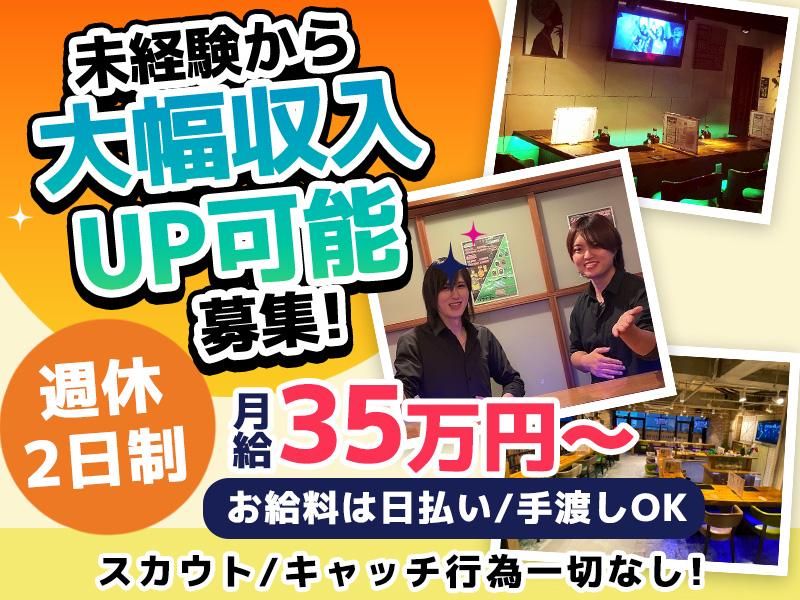 月給350,000円以上 給与詳細 基本給:月給 35万円 〜 固定残業代:なし 【一律手当】 全員に一律で支払われる通勤・皆勤・家族手当金額:なし 全員に一律で支払われるその他手当金額:なし \選べる勤務体系!休みの数が選べます♪/ ①月給35万円~(週休2日制) ②月給30万円~(完全週休2日制) 応募したその日に体験することも可能です★ 体験入社時は日給1万円 【働きやすい条件多数あり】  ̄ ̄ ̄ ̄ ̄ ̄ ̄ ̄ ̄ ̄ ̄ ̄ ̄ □お給料は日払い/手渡し □完全法令順守をお約束 □客引き/スカウト一切なし □未経験者ばかりなので、STARTしやすい◎ □空きポスト多数あり♪ など嬉しい条件多数! ・昇給/昇格随時 ・毎日日払いOK(5,000円まで) ・賞与年2回 ・大入手当有 ・昇給/昇格随時 ・最短3ヶ月昇進 ⇒全額日払い可 ■■□ 体験入店大歓迎! □■■ ※体験時間は相談可能です! ※シフトの関係上、「お仕事体験」ができない日もあります。 Q.ナイトワークが初めて Q.社員さんの雰囲気を知りたい Q.お店の雰囲気が気になる Q.キャストとコミュニケーションを取れるか不安.. Q.店長の人柄を知りたい などなど… 質問や相談ベースの体験も大歓迎です! やってもらうことは、 ・お客様のご案内 ・オーダーのお伺い ・ドリンクの配膳 など 一般的な飲食と変わりません。 楽しく、体験してみてください! 【給与例】 給与例 ★ 月収例 ★ ①P店のKH店長(入社2年目)..平均月収60万程度 ②A店のMY副店長(入社3カ月)..平均月収40万程度 ※全て手取りの額です!