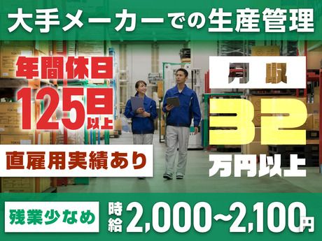 #時給2000円以上#月収32万円以上<大手メーカーでの生産管理>経験者求む!正社員登用実績あり!長期でキャリアプランが描けます!