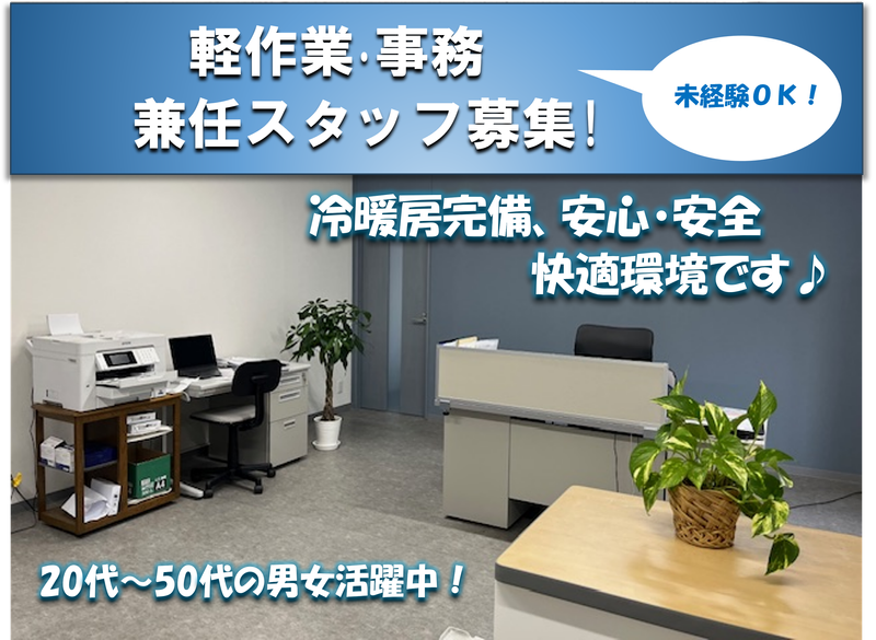 求めている人材 【必須条件】 ・高卒以上 ・Excelの基本操作が可能な方(関数などは不要) ・パソコンでの入力作業ができる方 【歓迎条件】 未経験/無資格さんも大歓迎! Wワーク/フリーターさん/主婦(夫)さん 活躍中です! 【こんな方にピッタリ】 〇一日中デスクワークなのは飽きる、体が凝ってしまうのが嫌だ 〇特に体力に自信はないけど、適度に体を動かす仕事もしたい ○コツコツ・モクモク作業が好きな方 ○子育てしながら働きたい方 ○家庭と両立しながら働きたい方 ○扶養内で働きたい方 ○文書作成やデータ入力が得意な方 ○事務未経験・ブランクがある方