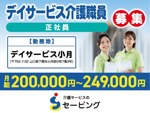 仕事内容 \月給20万円以上!定年75歳!賞与3ヶ月分実績の正社員募集/ 経験・資格不問!残業なし・日曜定休で働きやすい環境です! <仕事内容> 下関市小月にある「デイサービス小月」にて、利用者様の日常生活全般をサポートする介護業務をお任せします。 私たちのモットーは「人に寄り添う介護」。 利用者様が安心して、楽しく一日を過ごせるよう心を込めてケアを提供します。 具体的な業務は以下の通りです。 ・バイタルチェック、服薬対応など健康管理 ・入浴介助、日常生活のお世話 ・レクリエーションや機能訓練のサポート 当施設は、利用者様とスタッフの笑顔があふれる温かい雰囲気です。 残業は一切なく、勤務時間は8:15〜17:15の日勤固定で安定しています。 経験は問いませんので、介護に意欲がある方なら大歓迎です。 <おすすめポイント> ◎月給200,000円〜!賞与年3ヶ月分実績 安定した月給と、年2回の賞与(前年度実績 計3ヶ月分)で収入面も安心です。 ◎残業なし!8:15〜17:15の日勤固定 時間外労働なし。決まった時間で勤務でき、終業後の予定が立てやすい環境です。 ◎日曜固定休み!年間休日105日 日曜が固定休みのため、ご家族やご友人との予定を組みやすく、プライベートを充実できます。 ◎定年75歳!長く働ける再雇用制度あり 70代まで活躍できる環境と、退職金制度(勤続3年以上)があり、長期的なキャリアを支援します。 ◎経験・学歴不問!JR小月駅から徒歩10分 未経験からでも挑戦可能。マイカー通勤も可能で、通勤アクセスも良好です。 <求める人材> ・経験、学歴は不問!正社員として安定したキャリアを築きたい方。 ・介護福祉士の資格を活かし、さらなる安定を求める方(あれば尚可)。 ・残業なし、日曜休みで仕事とプライベートを両立したい方。 ・ご利用者様へ「人に寄り添う介護」を大切にできる方。 ・長く安定して地域社会へ貢献したい中高年・シニアの方(年齢制限74歳以下)。 株式会社セービングは、「職員一人ひとりの夢と笑顔を支える」会社として、働きやすい環境づくりに尽力しています。 当デイサービスでは、経験の有無に関わらず、利用者様への温かい気持ちを一番に評価します。 「高めの定年年齢(75歳)」と「賞与3ヶ月分実績」は、あなたの長年の経験や今後の活躍をしっかりと支える証です。 安定した正社員として、大きなやりがいを感じながら、私たちと一緒に利用者様の笑顔を創造しませんか。 面接では、あなたの不安や疑問を解消できるよう、丁寧にお話しさせていただきます。 まずはお気軽にご応募ください。 皆様からのご応募を心よりお待ちしております! ホームページ⇒http://www.e-saving.jp/
