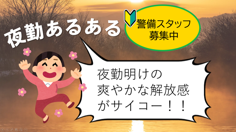 勤務時間詳細 実働時間:1日あたり8時間 平均勤務日数:1ヶ月あたり1日 〜 25日 日勤/(例) 08:00~17:00 (実働3h~8h/休憩1時間) ※現場による ※残業があった場合は別途支給 夜勤/(例) 23:00~08:00(実働5h~8h/休憩1時間) ※現場による ※残業があった場合は別途支給 【一日のスケジュール例】 ~通し勤務の場合~ <日勤> ▼自宅から現場に直行 08:00 勤務開始 (一日の段取り確認→役割分担決め→担当箇所の周囲の確認→誘導開始) 12:00 お昼休憩 13:00 誘導業務 15:00 勤務終了 ▼自宅に直帰 <夜勤> ▼自宅から現場に直行 23:00 勤務開始 (一日の段取り確認→役割分担決め→担当箇所の周囲の確認→誘導開始) 25:00 休憩 26:00 誘導業務再開 27:00 小休憩 29:00 勤務終了 ▼自宅に直帰