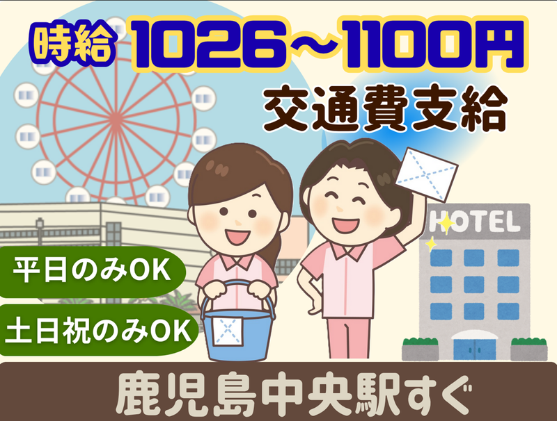 仕事内容 鹿児島中央駅スグのとってもキレイな 2つのビジネスホテルです。 ※2つの内1つをご選択可能です。 ①鹿児島中央駅前 ②鹿児島中央駅前西口 ベッドメイクや水回りなどのお掃除です。 難しい作業はなく、 家事の延長線でできますよ! 体を動かしながら働けるので 運動不足解消にもピッタリです! 基礎からお教えするので、 掃除が得意ではない… という方も安心してください! 未経験からでもプロの 掃除テクニックも身に付きますよ! ここでアルバイト・パートデビュー したスタッフも多数活躍中です。 < ガッツリ稼ぎたい方には > その他にもお仕事をご用意できます。 ご希望の勤務地や時間帯など、 気軽にご相談いただければと思います。