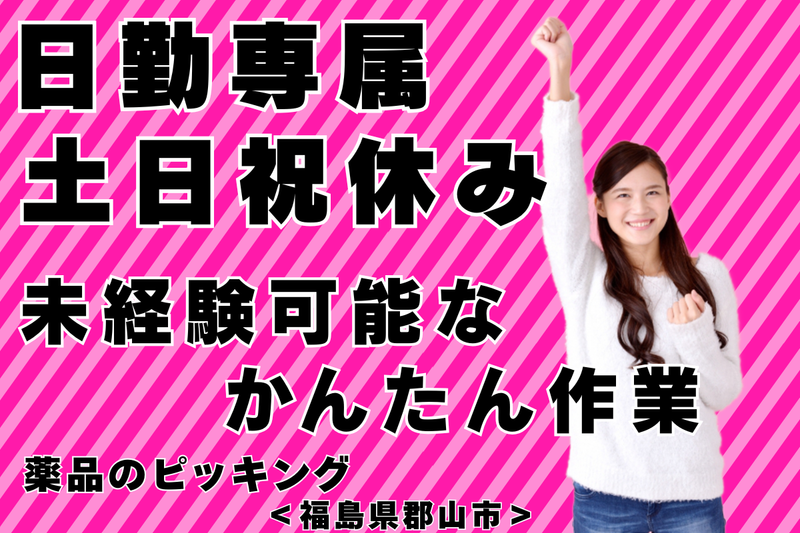 仕事内容 【 応募から2週間程度で内定可能! 】 ●未経験からのチャレンジ歓迎 ●20代・30代が中心の明るい職場 ●日勤のみ、土日休みで働ける 【 仕事内容 】 医薬品を製造している工場でのお仕事です! ピッキング作業をお任せします! ①パソコンで取り出したい 薬品のある場所を検索します。 ②検索後、所定の冷凍庫及び 冷蔵庫より薬品を取り出し 梱包ヤードへ運びます。 ③薬品を箱詰めし、 確認後出荷口まで運びます。 冷凍庫内及び冷蔵庫内での お仕事がメインとなりますが、 防寒着を着用しますので 快適にお仕事ができます。 《 未経験でも安心して働けます 》 男女比は6:4。20代~30代が活躍中! 仕事に慣れるまでは先輩スタッフが 丁寧にサポートしてくれるので、 工場でお仕事をしたことのない方も 安心して働ける職場です。 《 日勤のみで安心 》 夜、働きたくない方にオススメ! こちらの求人は日勤専属! さらに残業少なめ! 「自分の自由な時間を確保したい!」 「夜は寝たい!」 「昼間働いて、残業も そんなに多くない方がいい!」 そんな方にピッタリの求人です! 夜は自由時間。そこそこ働いて、 プライベートを充実させたい方はぜひ。 《 プライベート充実! 》 人気の日勤専属! 残業少なめ&土日祝休みなので、 プライベートの時間も しっかり確保できます。 《 マイカー通勤可能! 》 郡山駅から車にて 約10分程の距離の工場です。 工場周辺にはスーパーや コンビニ、有名ハンバーグ店などが 揃っていますので、仕事帰りの 買い物や食事にも便利な立地です! 《 先輩から一言 》 スタッフDさん(男性:24歳) ※4ヶ月前入社 工場での仕事は初めてでしたが、 職場の先輩方が丁寧に教えてくれるので 不安なく働けています。 以前の職場では残業が多く 私生活も疲れてしまい、 ただ時間が過ぎていくだけでしたが、 今は残業も少なく休みも しっかりとれるので 日中にジョギングをしてみたり、 友人と遊びに行ったりと 毎週何かしら予定を入れています(笑) 土日リフレッシュした分、 また仕事も頑張れるので メリハリがあって楽しく過ごせています。 工場では珍しく祝日もお休みなので、 自分のために使っています!