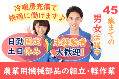 仕事内容 人気の軽作業♪時給1300円~日勤・土日休みで働きやすさ◎製品のラベル貼りや部品の組立をお任せいたします! <仕事内容> 燃料タンク・ボンネット・ライト周り・スピードメーター・ルーフなどトラクタ部品の製造工場になります。 ●組立(こちらは男性活躍中!) 組立に必要な部品を通し番号・アルファベット記載の棚からピッキングし電動ドライバーなどで組み立てしていきます。 ●軽作業(こちらでは女性が多数在籍、活躍中!) ・ピッキング ・製品のラベル貼り ・製品にコードを通す穴あけ作業(電動ドライバー使用) 立ち作業でのお仕事です。 ライン作業やグループ作業もございます。 ≪職場環境≫ 男女活躍中の職場です。 CDP派遣スタッフが在籍中です。 冷暖房完備です。 ロッカー有り アピールポイント <仕事内容> 燃料タンク・ボンネット・ライト周り・スピードメーター・ルーフなどトラクタ部品の製造工場になります。 ●組立(こちらは男性活躍中!) 組立に必要な部品を通し番号・アルファベット記載の棚からピッキングし電動ドライバーなどで組み立てしていきます。 ●軽作業(こちらでは女性が多数在籍、活躍中!) ・ピッキング ・製品のラベル貼り ・製品にコードを通す穴あけ作業(電動ドライバー使用) 立ち作業でのお仕事です。 ライン作業やグループ作業もございます。 ≪職場環境≫ 男女活躍中の職場です。 CDP派遣スタッフが在籍中です。 冷暖房完備です。 ロッカー有り \充実した福利厚生/ ◎社会保険・雇用保険完備 ◎有給休暇有(6ヶ月経過後、10日付与)※規定あり ◎残業手当 ◎交通費支給(規定内) ◎確定拠出年金制度 ◎週払い制度(週3回対応) ◎お友達推薦制度あり(規定有り) ※1名につき3万円~10万円臨時給与として支給 ◎車(マイカー)・バイク通勤可(無料駐車場あり) ◎作業服貸与 ◎食事持参可 ◎仕出し弁当注文可 ◎社員食堂あり ◎ロッカー利用可 ◎福利厚生プログラム (宿泊、グルメ、ショッピングなど大幅割引が受けられる10万アイテムのメニューがあります。)
