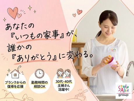 仕事内容 週1~2回勤務。スタジオアリスグループが自治体から委託を受けて行う「子育て・家事支援サービス」です。 子育て経験や家事スキルを活かしながら、ご家庭とお子さまの生活を支えるやりがいあるお仕事。資格を活かして、地域貢献が可能! ○・。☆―――――――――――――☆。・○ \この求人のポイント/ ■スタジオアリスグループのオシゴト ■週1、2h~直行直帰OKでスキマ時間に働ける ■副業/Wワークや扶養内もOK ■子育て経験や家事スキルが活かせる ■履歴書不要&面接1回! ○・。☆―――――――――――――☆。・○ スタジオアリスグループの子育て支援事業として 支援の必要なお子さまがいるご家庭に訪問し、家事や育児のサポートを通じて、ご家庭が安心して過ごせるようお手伝いしていただきます。 <具体的には> ■家事支援 掃除・洗濯・調理など、普段の家事経験がそのまま活かせます。 ■子育て支援 お子さまの見守りや送迎、遊びのサポートなどを行います。笑顔や安心感を届けながら、成長を一緒に見守る大切な役割です。 <仕事の流れ> 行政から当社に寄せられる子育て支援の依頼に対し、内容・日時・場所などを踏まえて、サポート可能な方に支援を担当いただきます。支援の日程を調整した上で、決定した日時にご家庭を訪問。支援終了後は、簡単な書類を提出して完了です。 直行直帰で働けるため、ご自身のライフスタイルに合わせて柔軟に働くことが可能です。子育ての経験を活かしたい方や、空き時間を有効活用したい方にぴったりな仕事です。 \安心のサポート体制 / 支援中に困ったことがあっても、必ず当社と自治体が対応。動画研修や講習なども充実しており、初めての方でも安心です。 \こんな方にもオススメ/ 保育園・小規模保育園・企業内保育の勤務経験者 学童保育、児童養護施設、企業主導型保育園・医療センター・こども園・NPOでの勤務経験者 発達障害児・院内保育室・児童発達支援センター・プリスクール・学童保育指導員・民間学童保育での経験を活かしたい方 社会福祉法人・児童指導員・放課後児童支援員・保育士・保育補助・幼稚園教諭やベビーシッターの勤務経験者 民間託児所や事業所内保育所、病院内保育の勤務経験がある方 児童発達支援の分野で活躍されていた方 児童福祉施設で児童発達支援員として働いたことがある方 放課後児童指導員として学習支援業務をしたことがある方 心理学科卒の方 福祉業界で社会貢献がしたい方 身体介護・生活援助・ケアワーカー経験者 子育て卒業により社会復帰・職場復帰をお考えの方 資格取得をしてスキルアップしたい方 宿直・住宅型有料老人ホーム・介護デイサービスの勤務経験者 介護初任者研修・ サービス提供責任者・デイサービス介護職員経験のある方