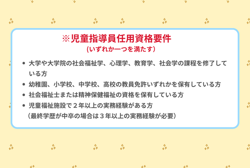 求めている人材 *26年3月専・短・大卒予定者、 第二新卒歓迎 *中途採用の方も新年度(26年度4月) からの勤務でも歓迎 *【児童指導員任用資格】 ・4年生大学または大学院の教育学部、心理学部、社会学部、社会福祉学部を卒業する ・福祉系の専門学校など、厚生労働省の指定する児童指導員養成施設を卒業する ・高卒以上の学歴を有したうえで、児童福祉の実務経験を2年以上積む ・幼稚園・小・中・高いずれかの教員免許を取得する ・社会福祉士資格または、精神保健福士資格を取得する ・児童福祉施設での実務経験を3年以上積んだ後に、厚生労働大臣または都道府県知事も認定を受けることで、任用資格要件を満たす方法もあります。 *普通免許ある方も尚歓迎 *保育園等からの転職者活躍中! *ブランクのある方も歓迎