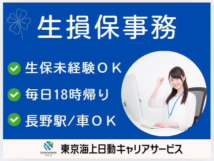仕事の内容 \損保事務経験があればOK、社員登用可能性あり/ ◆東京海上日動トップクオリティ代理店 ◆車通勤OK!駐車場完備 ◆毎日18時帰りでご家庭との両立も〇 【基本情報】 雇用形態:派遣社員 雇用期間:長期(3カ月以上) └1月~開始日相談可能 就業時間:9:00~18:00(休憩60分) 【必須条件】 ◆損保事務のご経験がある方 ◆パソコン:基本操作(入力~修正) 【お仕事内容】 ・見積もり ・計上 ・電話対応 ・資料作成~発送 など ◆損保募集人資格はお仕事スタートまでの取得でOKです 【こんな方にオススメ】 ・損保の経験をいかして働きたい ・ある程度流れの決まった業務が好き ・フルタイムでも家庭とムリなく両立したい 【環境面等】 ・@長野駅から車で20分 ・保険総合コンサル会社です ・お弁当持参OKです ・オフィスカジュアル内で服装自由 【福利厚生等】 ・社会保険完備 ・ベネフィット・ステーション ・定期健康診断あり ・車通勤OK(駐車場あり) ・禁煙オフィス!煙苦手な方も安心 ・平日のみOK!土日祝休み ・年間休日120日以上&お休み相談可 └有給休暇 ○●ご応募検討中の方へ●○ ・安定した環境で、無理なくお仕事したい方にぴったりの職場です!ご応募お待ちしています! ○●嬉しいPOINTたくさん!●○ 履歴書不要!開始日相談OK/長期/ブランクOK/生保未経験OK/月収例21万円以上/社会保険完備/18時退社/8時間以内勤務