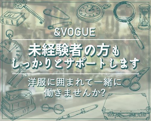 仕事内容 好きなものに囲まれて、 「自分らしさ」を楽しむ仕事をー お気に入りの洋服や、心がときめく雑貨。 誰かの「好き」にそっと寄り添う。 そんなand.vogueのアイテムたちが並ぶ店内で、 あなた自身も“自分らしいスタイル”で働いてみませんか? 【どんなお仕事?】 ・and.vogueのお洋服や雑貨の接客販売 ・商品のレイアウトやディスプレイ ・レジ対応や品出し、ストック整理 など 【はじめから全部できなくていいんです】 and.vogueが大切にしているのは、 “モノ”より“コト”を届けるような接客。 「これ、私も持ってます」「これ人気なんですよ〜」 そんな何気ない会話で、 お客様が思わず笑顔になる瞬間を一緒につくっていきましょう。 まずは、あいさつや笑顔からでOK。 あなたらしいペースで少しずつ慣れていってくださいね。