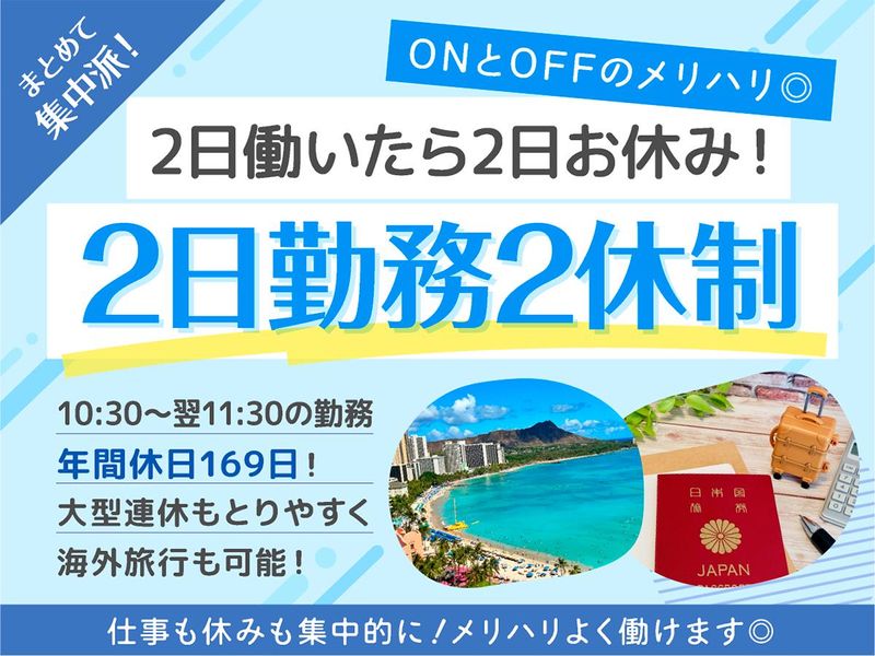 休日休暇 ☕2勤務2休制 ※月7~8回勤務 +月1回フロントミーティング有 1日目:1日勤務(10:30~出社) 2日目:11:30まで勤務 3日目:お休み 4日目:お休み 2日勤務2休制はこの繰り返し! 1回の勤務でまとめて働く分、 その後しっかり休める 休日を設けています。 ⭐年間休日169日⭐