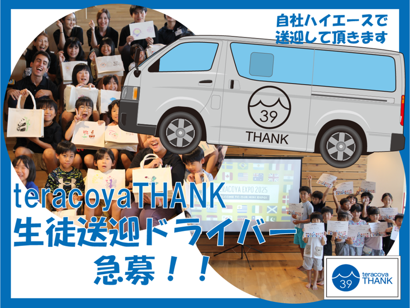 仕事内容 ⭐平日15時〜18時の間の短時間勤務 ⭐最大9名/ハイエース送迎 ⭐安全第一!安定したルート運行 ⭐子どもと笑顔で関われる仕事  ̄ ̄ ̄ ̄ ̄ ̄ ̄ ̄ ̄ ̄ ̄ ̄ ̄ ̄ ̄ ̄ ̄◥ 子どもたちのワクワクをのせて。 英会話教室の送迎ドライバー募集! ◣_________________ 子ども向け英会話教室「teracoyaTHANK」 に通う生徒さんを、安全に送迎する お仕事です。 車種は10人乗りのハイエース。 ルートや乗車メンバーは日によって変動しますが、 慣れればスムーズに運行可能です。 運転好きの方、子どもと接するのが好きな方にピッタリ! ▼1日の流れ(例:月曜) 15:00 出勤・出発準備 15:30 1便目送迎開始 16:20 帰着・休憩 16:30 2便目送迎開始 17:20 帰着・報告 18:00 終了 ⭐安心できる運転スケジュール 曜日ごとに運行回数が決まっており、 時間に余裕をもって運転できます。 月・木・金は2便、火・水は1便のみなので、 無理なく安定したペースで送迎に取り組めます。 ⭐柔軟なシフト体制 「週5は少し不安…」という方も大丈夫。 シフトは週2日から応相談。 2名体制も可能なので、 無理なく続けたい方や他の予定と 両立したい方もぜひご相談ください。