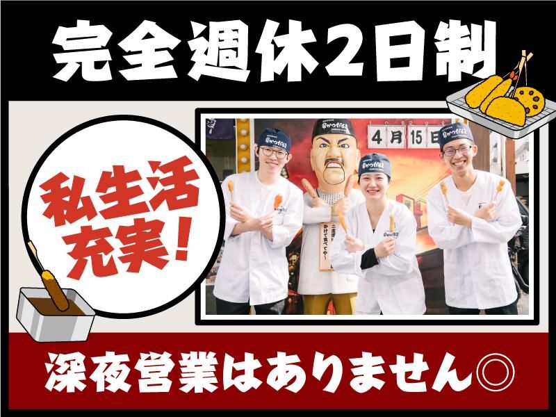 仕事内容 *高収入!月給28万円以上+賞与年3回! *家族手当・住宅補助なども充実! *深夜残業は一切なし! *完全週休2日制&年間休日112日! *転勤なし&全店駅チカ! *働きやすい環境で抜群の定着率! *平均年齢30歳!学歴や年齢不問! //////////////////// <電話でのお問い合わせ> 06-6636-1559(採用担当)まで //////////////////// 実際に活躍している先輩社員のインタビューや、待遇についてHPでもご覧いただけます! 【株式会社一門会 採用HP】 https://kushikatsu-daruma.recruitment.jp/ 【仕事内容】 店舗でのホール業務や調理など店内業務全般をおまかせします。 ※深夜残業はありません。 ~具体的には~ ・ホールでの接客 ・ドリンク作り ・調理(揚げ場に渡すネタづくり) ・揚げ場 など 【ゆとりある体制で焦ることなし!】 各店、常時3~7名の社員を配置しており、余裕のある体制で営業しているので、経験が浅い方でも安心。一人で業務を抱え込み過ぎてパニック…なんてことはありませんよ!すぐ近くに先輩社員がいる環境なので、分からないことは気軽に聞いてくださいね*。 【スキルに見合った評価をします!】 揚げるスキルなど各種社内資格を設置!技術力の向上を正当に評価し給与に反映させていくので、さらにモチベーションを高めて働けます。 【業界内でも珍しい完全週休2日制!】 「しっかり休んでしっかり働く」という社風が根付いているからこそ、業界内でも珍しい完全週休2日制で無理なく働ける体制を整えています!お子さんがいる方、私生活も大切にしたい方、どんな方も気持ちよく働ける職場づくりに力を入れています! 【従業員全員が納得できる環境をご用意!】 完全週休2日制・賞与年3回・深夜営業なし・住宅補助・家族手当など社員の方々が、安心して長く働ける環境を整えています!誕生日プレゼントなど自社独自の待遇もあり、定着率も高め。長く働ける環境をご用意しています。 【採用担当より】 面接では、あなたの「人柄」について、そしてなぜ「だるま」を希望されているのか?この2点を主に伺います。給与や勤務時間など労働条件もしっかりご説明しますので緊張せず、安心してお越しください!