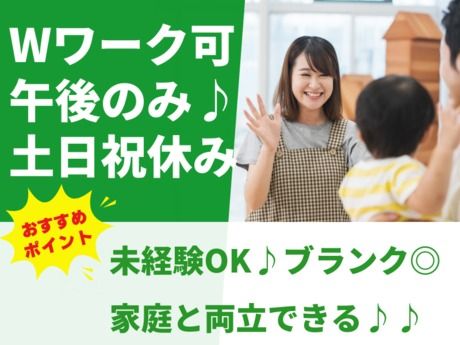 仕事内容 \ここがポイント/ ★土日祝休み&短時間勤務で働きやすい◎ ★5年以上続くスタッフも!定着率バツグン! ★未経験・ブランクありでも安心スタート♪ *・。・。*・。・。*・。・。* <仕事内容> \子ども好きな方大歓迎♪学童保育スタッフ/ 小学生の子どもたちの放課後を、 楽しく・安全に見守るお仕事です♪ ●子どもたちの見守り・安全確認 ●外遊び・室内ゲーム・読み聞かせなど ●宿題のお手伝いや学習の習慣づけサポート ●入退室の管理や簡単な連絡対応 ●室内清掃や道具の点検などの環境整備 子どもたちの笑顔に囲まれて、 毎日が明るくやりがいのある職場です◎ 未経験の方も安心! 丁寧なフォローと優しい職場環境で、 長期で働くスタッフも多数活躍中♪ 午後の短時間勤務だから、 家庭との両立やWワークにもピッタリです! *・。・。*・。・。*・。・。*