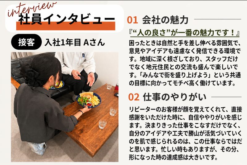 【仕事内容】 新規オープン! “働きやすさ”と“やりがい”を叶える カフェスタッフを正社員で募集! \こんな方いませんか??/ ────────────── #オシャレな空間で自分らしく働きたい方 #気の合う仲間と楽しく仕事したい方 #人に喜んでもらうことが好きな方 ────────────── その働き方、当店で叶います! ================ 【カフェスタッフの推しPOINT】 ================ ▷頑張りは給与で還元 └賞与年2回、2024年は4.5ヶ月分支給 設立から毎年支給している安定企業! ▷残業少なめ・連休取得可能◎ └月3~5日の希望休あり! 旅行や趣味の時間も充実できます! ▷髪型/髪色自由&ピアス/ネイルOK └オシャレも仕事も両方楽しめる職場です! ▷オープニングスタッフ募集 └スタートが同じだから人間関係フラット イチから居心地の良い職場を築けます◎ ================ ◆「CAFE MOOI」について 今年の11月、道の駅に新たにオープン! 地元食材を使用したパンケーキが自慢のお店 一緒に理想のカフェをカタチにしましょう♪ ▷クリスマスなど季節イベントの企画や、 「こんな商品を出したい」といった提案も可能! 自分のアイデアをお店づくりに反映できる環境です ★Instagram:@cafe.mooi_ |主な仕事内容 ・お客様ご案内/注文対応 ・ドリンク作成/料理提供 ・簡単な調理補助(盛り付けなど) ・会計/片付け/清掃 ・SNS更新(Instagramなど) ※軽自動車で商品運搬をお願いする場合あり (月1~2回程度/市内のみ) (自家用車使用時は交通費支給) 慣れてきたら… ・在庫管理/発注業務 ・衛生管理(食材管理や衛生ルールのチェックなど) 店舗運営にも関われるポジションです ◆カフェスタッフ未経験でも心配不要♪ まずはメニューを覚えることから始めます しっかりサポートいたしますので、安心してスタートできます ラテアートも取り入れており、 ご希望があれば少しずつ技術を身につけることも可能です◎ ◆やる気次第でスピード出世可能! ”まずはやってみよう”の精神を大切にしています 困ったときは必ず周りがフォローするので、安心して挑戦できる環境です! 年功序列ではなく、頑張り次第で1年目からステップアップも可能◎ 将来は店舗責任者やマネージャー業務にも携われます! |職場環境 20代~40代のスタッフ4名が在籍中 地元勝山が大好きな優しいメンバーです♪ 各地から訪れた方々に勝山の魅力を笑顔でお届けしています! ▷カフェを貸し切って地域企業と就活生の交流イベントが行われるなど、 地域振興にも役立てられている環境です |勝山DMOについて 地域資源を活かした商品開発や施設運営など 勝山の産業発展や魅力向上を目指す地域創生企業です 観光を通じて地元を元気にしたい!そんな思いで活動中です! ◆Web面接OK◆ まずは話だけ聞いてみたい...など、 当社のカフェスタッフに興味のある方、ご応募お待ちしています!