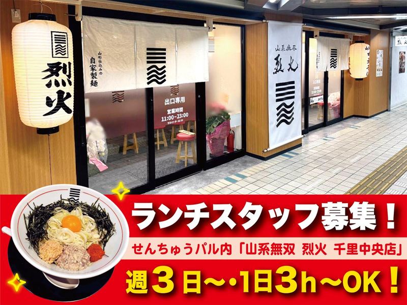 仕事内容 〓〓〓〓〓〓〓〓〓〓〓〓〓〓〓〓 今年の4/29にオープンしたお店 を一緒に盛り上げてくれる ランチタイムスタッフを大募集⭐ 〓〓〓〓〓〓〓〓〓〓〓〓〓〓〓〓 \\おすすめポイント!//  ̄ ̄ ̄ ̄ ̄ ̄ ̄ ̄ ̄ ̄ ̄ ̄ ̄ ✅ 8年連続“食べログ百名店選出のラーメン店【山系無双 烈火】 ✅ ランチタイムの限定募集です! ✅ シフト自由!週3日・1日3h~OK! ✅ 土日祝の時給+30円UP✨ ✅ 駅改札から30秒で雨でもノーストレス♪ ✅ 学生さん、フリーターさん、主婦(主夫)さん歓迎✨ ✅ 従業員価格のまかない:1食300円! 【主な仕事内容】 山形ラーメン「山系無双 烈火 千里中央店」にて、ランチタイムのホール接客と簡単な調理補助をお願いします! まずはできることから、あなたのペースでスタート♪ <ホール> ◆食券受け取り・オーダー入力 ◆配膳・下膳(現金管理なし) ※食券制なのでレジ会計はなし! <キッチン> ◆麺ゆで・トッピングなど補助調理のみ ◆セントラルキッチン式で仕込みほぼなし! ※セントラルキッチンから毎朝食材が届くので、難しい調理はありません! <研修> まずは14種のメニューを覚えるところからスタート!社員&先輩が横について教えます。 そのあとはトッピングや調理などを少しずつ覚えていってくださいね♪ こんなお店です!!  ̄Ⅴ ̄ ̄ ̄ ̄ ̄ ̄ ̄ ”ラーメン大国” 山形県の「山形ラーメン」「蕎麦」「食材」にこだわり、美味しいラーメンをご提供すべく日々精進しています。 大人気の山形ラーメン【山系無双 烈火(れっか)】が多くのお客様に愛されています。 ここまで支えてくださった皆さんへの感謝の気持ちを忘れず、「人に優しく、愛情をもち、社会に貢献できるように」の理念を大切に店舗づくりをしています。 ⭐ご応募をお待ちしています⭐