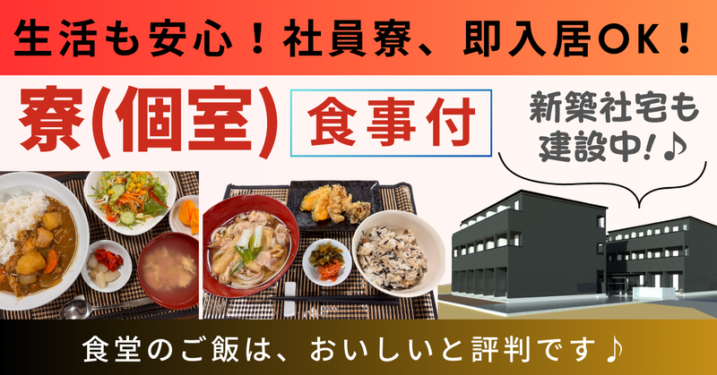 【保険制度】 雇用保険、労災保険、健康保険、厚生年金 待遇・福利厚生 【福利厚生】 ●賞与年3回/規定 ●昇給制度・表彰制度(報奨金)/規定 ●作業着・道具支給又は貸与あり/規定 ●マイカー通勤可・駐車場有 ●資格取得全額会社負担 社 員 寮 * 詳 細  ̄V ̄ ̄ ̄ ̄ ̄ ̄ ̄ ̄ ̄ ̄ ̄ ̄ ̄ ̄ ̄ ●即入寮可 ●寮から現場まで送迎あり ●全室個室のプライベート空間 ●寝具・エアコン・TV完備 ●社員食堂・夕食付