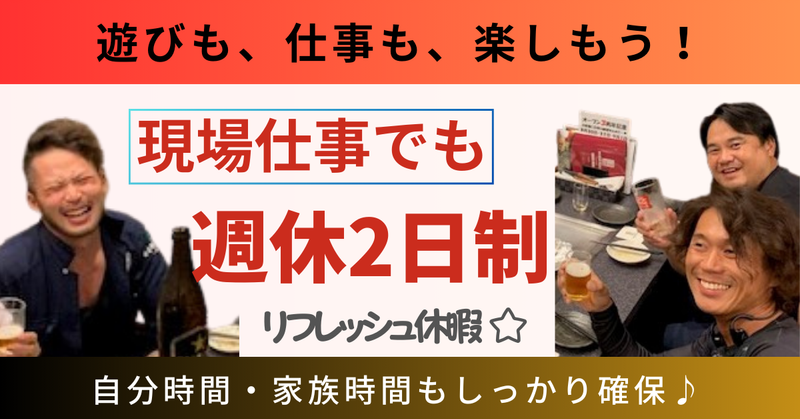 固定時間制 勤務時間詳細 実働時間:1日あたり8時間 平均勤務日数:1ヶ月あたり22日 現場作業時間:8:00~17:30 ※多少変動有 最低勤務日数:週5日 ★残業ほぼなし
