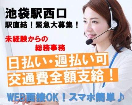 仕事内容 未経験から始める「人を支える仕事」!5月入社で新しい環境にゆとりを持ってスタートできます。 - 5月からの新しいスタートを望む方にも最適なお仕事◎ - 社員が快適に働けるようサポートする、 総務部での事務業務です。 ・。・。・。・。・。・。・。・。・。・ ▼具体的な業務内容▼ ・入社時の備品手配、 ID・パスワード発行 ・データ入力・電話対応 ・社内便や郵便物の仕分け・配達 ・備品の発注、在庫管理、消毒巡回など 「人の役に立つことが好き」な方に ぴったりのポジションです! ・。・。・。・。・。・。・。・。・。・ ★こんな方におすすめ  ̄V ̄ ̄ ̄ ̄ ̄ ̄ ̄ ̄ ̄ ・頼られると嬉しい、 人のために動くのが得意な方 ・明るく落ち着いた対応ができる方 ・チームで協力して仕事を進めたい方 ・コツコツ作業も、人とのやり取りも バランス良くできる方 ★魅力ポイント  ̄V ̄ ̄ ̄ ̄ ̄ ̄ ̄ ̄ ̄ ◇5月入社で安心のスタート時期! ◇池袋駅直結で通勤ラクラク ◇残業ほぼなしでワークライフバランス◎ ◇服装オフィスカジュアル ロッカー&休憩室あり ◇20~40代の女性スタッフ活躍中! ================== 「新年から新しい職場でリスタートしたい」 そんな方にぴったりの環境です。 質問だけでもOK! お気軽にご応募ください♪