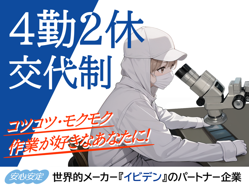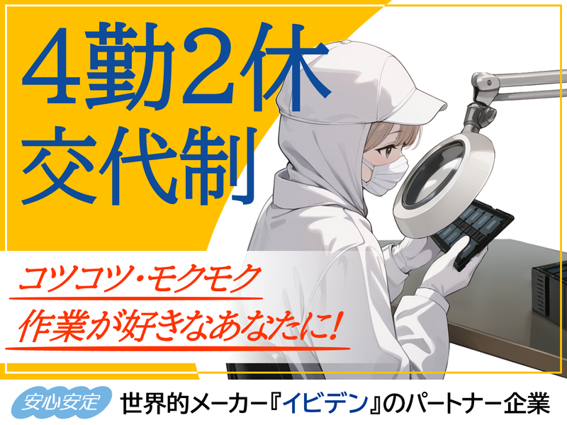 仕事内容 電子基板の検査をお任せ! ■具体的な仕事内容  ̄ ̄ ̄ ̄ ̄ ̄ ̄ ̄ ̄ 検査機や顕微鏡を使い、傷、凹凸、汚れ、異物の付着がないか検査していただきます。 *検査機に引っかかったNGの製品を目視で再検査し良否の判定をする *技能実習生がいる時は英語・タガログ語で通訳しながら検査の手順や技術を教育 *他、不随する業務 ■この求人のアピールポイント  ̄ ̄ ̄ ̄ ̄ ̄ ̄ ̄ ̄ ̄ ̄ ̄ ̄ ̄ ✅世界的メーカー『イビデン』のパートナー企業!長く安定して働けます◎ ✅未経験活躍中!イチから丁寧に教えます! ✅気温25度のクリーンルームで作業する為、快適♪ ✅年間休日120日!プライベートと両立して働けます★ \ 女性活躍中! / 充実した育児支援制度、男女別の化粧室・・・ など女性スタッフが働きやすい環境を整えてます♪ 休憩もしっかり取れる職場です! 勤務地は大手企業の工場内の為、休憩所や食堂があります。 お弁当を持参している方も多く、電子レンジも気軽に使用できますよ◎ ■モノづくりを支えて創立36年!  ̄ ̄ ̄ ̄ ̄ ̄ ̄ ̄ ̄ ̄ ̄ ̄ ̄ 今回は増員によって体制強化を図る為の正社員の募集です。 入社後のフォローも万全で未経験の方も安心してチャレンジできますよ! 長く安定して働きたい方、未経験からステップアップ・成長しながら働きたい方、大歓迎◎