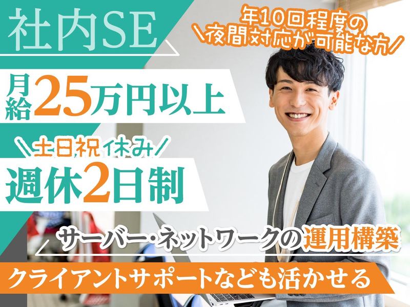 求めている人材 ✅ヘルプデスク経験がある方 (問い合わせ対応・技術サポートなど) サーバー・ネットワークの構築運用、 クライアントサポート、社内SE、 社内ヘルプデスク、テクニカルサポート、 システムエンジニア、IT事務、運用保守、 情報システムなどのスキル・経験が活かせます! ■普通自動車免許(AT可)をお持ちの方 ■PCやスマホの基本知識がある方 ■年10回程度の夜間対応に柔軟に取り組める方 - 「人の役に立ちたい」 「誰かに頼られる存在になりたい」 「会社全体を支えるポジションで成長したい」 そんな方にぴったりのお仕事です!