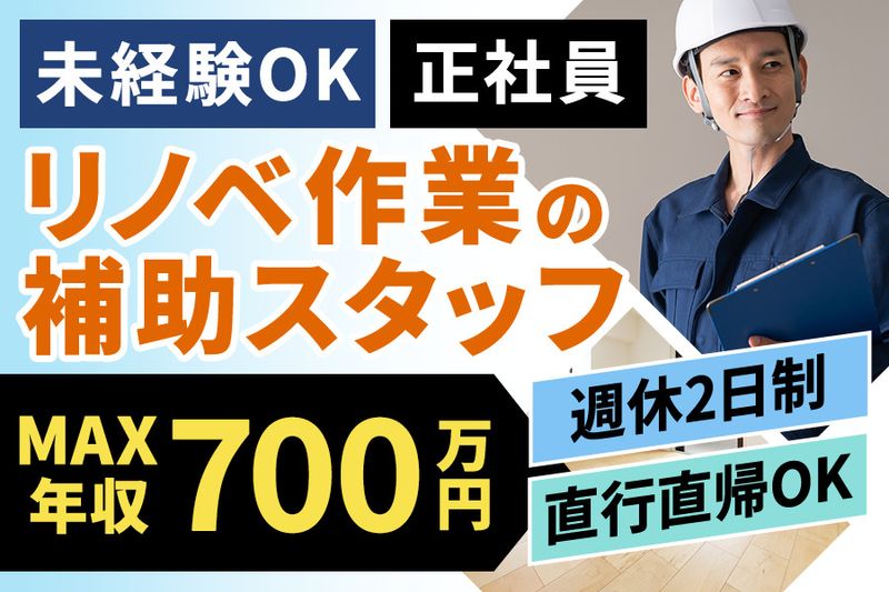 【雇用形態】 正社員 【契約期間】 試用期間3~6ヶ月(本採用と同条件)。その後、無期雇用。 【その他】 #未経験者歓迎 #学歴不問 #フリーター歓迎 #普通自動車 #経験者歓迎 #有資格者歓迎 #ブランクOK #40代以上応募可 【このような方が活躍しています】 建築、建設業界のリフォーム、リノベーション会社でカンタン作業スタッフ(現場作業員、建築作業員、手元作業員、一般作業スタッフ、養生スタッフ)として未経験から働きたい方。現場作業員やカンタン作業スタッフ経験者の方。駅近で週休2日制、土日祝休みOK、賞与年2回のリノベーション会社でカンタン作業スタッフとして働きたい方。未経験OK、ブランクOK、フリーター、中高年、学歴不問で中卒や高卒層も活躍する職場で働きたい方。カンタン作業スタッフとして正社員で働きたい方。カンタン作業スタッフを新着急募。カンタン作業スタッフ、正社員、軽作業、中高年、土日祝休み可。 求人ID【P-STK02】