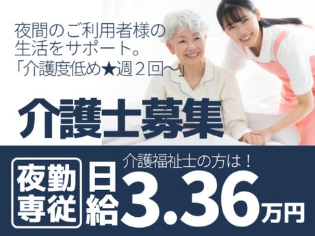 \初任者以上★日給3万円超え/夜勤3フロアを2名体制|週2回~相談OK|残業ほぼなし|平均介護度2.08程度