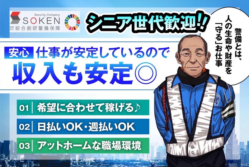 仕事内容 <アピールポイント> ―――――――――――――――――――― ◆日払・週払いOK ◆主婦・元気なシニア・未経験者活躍!! ◆扶養内勤務・週2日~勤務OK!! ☆交通誘導警備・雑踏警備・列車見張り等を メインに現場の「安全」を確保!未経験か らでも研修があるので大丈夫です!現場で も2名体制以上なので安心です! <仕事内容> ―――――――――――――――――――― 建設・工事現場、イベント会場等で、関わる すべての人達に安心と安全を提供します。 【交通誘導警備業務】 国道・県道・市道で、片側通行・歩行者誘 導・通行止め・車線変更や、工事車輌の誘 導等を行います。 【雑踏警備業務】 各種イベント会場において会場内外の安全 を確保します。 【駐車場警備】 ス-パ-・銀行・神社などの、駐車場の出 入口で、お客様の車輌と歩行者・一般車輌 との接触事故防止や、周辺道路の渋滞緩和 に努めます。 <担当者からのメッセージ> ―――――――――――――――――――― 貴方は、「今どのような気持ち」で、お仕事 を探されていますか? 「今までいろんな会社を転々としてきた」 「借金人生から抜け出したい」 「もう親に心配や迷惑をかけたくない」 「こんなダメな自分をかえたい」 「とにかく稼ぎたい」 「人を護る仕事をして、自分を高めたい」 「カッコイイ制服が好きだから」 上記のようにお仕事を探している「環境や理 由」は本当に様々だと思います。 私たち綜合創研警備保障は貴方が描く「希望 の働き方や働く目的」を、叶えられるようサ ポートします。 まずはお気軽にお問い合わせください! <綜合創研警備保障の取り組み> ―――――――――――――――――――― 【SDGsの取り組み①】 主婦の方の扶養内勤務や、シニアの方達の再 雇用に力を入れ、社員が長く働ける職場作り を行なっています。 【SDGsの取り組み②】 社員全員は給与と別に評価制の手当支給があ りますので、性別に関係なく、いつ又何歳で 入社しても、毎月安心して公平な評価(手当 )を受けることが出来ます。 【未来に対する取り組み】 2022年より、AIを活用した交通誘導業務 にも力を入れてます。 上記の取り組みを通して、私たち綜合創研警 備保障はこれまで以上に多くの方に「安心」 をお届けできるよう邁進していきます! 貴方の挑戦(ご応募)お待ちしております!