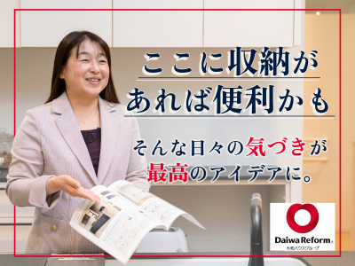 求めている人材 <業界未経験歓迎> 【必須条件】 ■高卒以上 ■普通自動車免許 ■マイカー持ち込みで勤務できる方(通勤・お客様先訪問のため/手当あり) 【歓迎条件】 ■営業経験のある方 ■お客様との信頼関係構築への意欲がある方 【歓迎する経験・資格】 ■リフォーム業界未経験でも、不動産業界・建築関係の営業をしていた方 ■宅地建物取引士、一級建築士・二級建築士、1・2級建築施工管理技士、インテリアコーディネーター等 ■建築系の資格をお持ちの方や設計・施工管理経験者 - \ 支えてくれる仲間がいます! / 異業種からの転職や未経験で始める人が多いのも特徴です。周りには、あなたと同じく未経験で始めた先輩達がいてサポートしてくれますし、一緒に仕事をする点検や設計、施工管理という技術のプロたちもいます。少しずつ専門知識を身につけ、案件ごとに経験を積みながら仕事に取り組んでみてください。気がつけば、あなた自身も「リフォームの専門家」の一人として成長している自分に気づくと思います。 - \ 社員インタビュー / ■企業規模や充実の福利厚生も魅力 東証プライム上場の大和ハウス工業を中心とする「大和ハウスグループ」のリフォーム専門会社ですから、安定性はいうまでもありません。そんな企業規模を背景に、もちろん福利厚生なども充実しています。とにかく安心して長く快適に働けるのが最大の魅力だと思います。 (リフォームアドバイザー・営業/入社6年目) ……… ■腰を据えて、安心して働ける。 過去の転職は、結婚した時や、子どもができたことで家族と過ごす時間をもう少し作りたいと考えた時など、労働環境が理由になることもありました。入社して、当社はその環境が整っていると、改めて実感します。リフォーム未経験の方はもちろん、リフォームの仕事が好きな人にもお勧めです。 (リフォームアドバイザー・営業/入社6年目) ……… ■家づくりに関わる仕事の中の花形! 住まいに関わる仕事の中で、営業はお客様のご要望を形にする大事な仕事です。お客様の望みを実現し、信頼をいただくことで成果が上がり、お客様にも喜んでいただける。そして、それを頑張った分だけ、評価される。良い循環を生むことができる、すごく恵まれた環境・仕事だと思います。 (リフォームアドバイザー・営業/入社12年目)