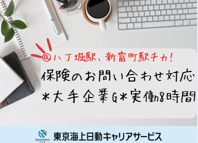 仕事の内容 \社内×保険の問い合わせ対応/ ◆ご経験生かして大手企業Gで活躍 ◆実働8時間→残業少なめでも月27万~! 【基本情報】 雇用形態:派遣社員 雇用期間:長期(3カ月以上) 就業時間:9:00~18:00(休憩60分) 【必須条件】 ◆保険会社または保険代理店でのご経験がある方 ◆損害担当のご経験がある方 ◆パソコン:基本操作(入力~修正) ◆損保募集人資格お持ちの方 └期限切れの方も応募OK! 【お仕事内容】 ◆グループ従業員や営業所から保険のお問い合わせ対応 ・保険の請求や支払い、商品について ・保険会社へ事故報告 など *見積書など書類作成~計上など契約に関する事務はありません! 【環境面等】 ・@八丁堀駅、新富町駅/最寄り駅から徒歩4分 ・30代・40代・50代の多い職場 └幅広い年代活躍中/子育てに理解ある主婦(夫)が活躍中 └わからないことは質問、確認をしながらオシゴトできる環境です ・オフィスカジュアル内で服装自由 └個人ロッカーあり 【福利厚生等】 ・ランチタイムは休憩スペース利用OK └お弁当持参OKです/周辺にはコンビニや飲食店が充実 ・ベネフィット・ステーション ・社会保険完備 ・定期健康診断あり ・禁煙オフィス!煙苦手な方も安心 ・平日のみOK!土日祝休み ・年間休日120日以上&お休み相談可 └有給休暇 ○●嬉しいPOINTたくさん!●○ 履歴書不要!開始日相談/長期/駅チカ/駅歩5分以内/主婦・主夫活躍中/子育てに理解のある職場/ブランクOK/社保完備/8時間以内勤務