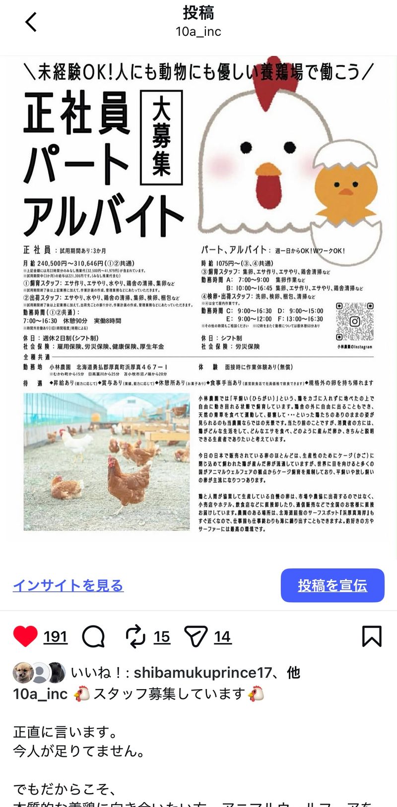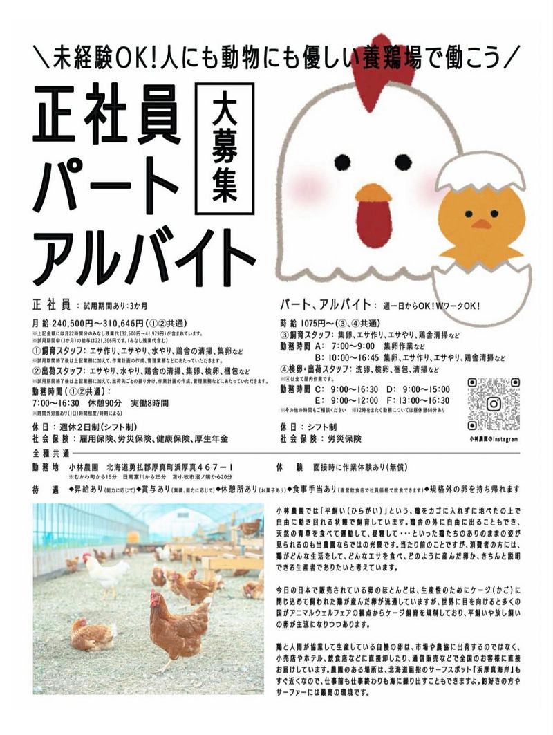 アピールポイント: 正直に言うと、楽な仕事ではありません。 朝も早く、体力も使います。 生き物相手なので、思い通りにいかないこともあります。 その代わり、 ただの作業では終わらない仕事です。 私たちは、 平飼い・放牧養鶏を行い、 アニマルウェルフェアを前提とした飼育を実践しています。 薬や効率に頼りすぎず、 「生き物にとってどうあるべきか」を基準に、 日々の環境を整える仕事です。 特別なことをしているつもりはありません。 当たり前のことを、当たり前にやる。 それを本気で続けています。 消費者の方に鶏がどんな生活をしてどんなエサを食べ、どのように産んだ卵かをきちんと説明できる生産者でありたいと思っています。 こうして、こだわって生産している自慢の卵は、市場や農協に出荷するのではなく、小売店やホテル、飲食店などに直接卸したり、通信販売などで全国のお客様に直接お届けしています。 農園のある場所は、北海道屈指のサーフスポット『浜厚真海岸』もすぐ近くなので、仕事前でも仕事終わりでも海に繰り出すこともできますよ。釣り好きの方やサーファーには最⾼の環境です 。 小林農園ホームページ https://kobatama.com テンアール株式会社ホームページ https://10a.jp Instagram https://www.instagram.com/10a_inc/