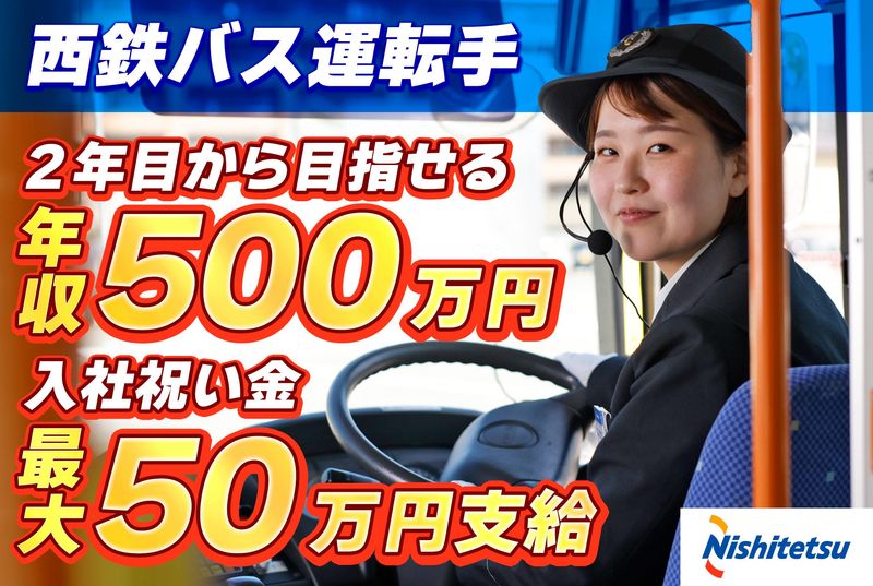 仕事内容 入社後は、通勤・通学・お出かけ等に利用される路線バスの運転士として勤務します。 社内試験に合格すれば、高速バスや全長18mの連節バス 観光客の方に大人気の「福岡オープントップバス」などへのチャレンジもOK! また、運行管理者や営業所長へのステップアップも可能です♪ ⭐ほとんどの方がバス運転士未経験からのスタート⭐ 丁寧な教育プログラムでプロの運転士へと育成します! 座学、教習コースでの運転、空車教習、営業運行教習など、 スキルに合わせて4~6ヵ月間の研修を実施。 単独乗務後のフォローアップ研修も充実しているので、安心してスタートできます◎ □■研修■□ 【座学】 講師陣による学科授業で、安全運転のために必要な事項を丁寧にレクチャーします。 ↓ 【教習コースで運転】 自社所有の研修センターの広大な教習コースにて実践的な運転技術を習得! 実際の車道と同様の信号やS字レーンも充実! ↓ 【空車教習】 配属先で、指導員同乗のもと実際に路線を運行 ↓ 【営業運行教習】 指導員同乗のもと、お客さまを乗せて営業運行開始! ↓ 【単独乗務へ!】 *・*・*・1日の流れ*・*・*・*・ アルコール検知 ↓ 出勤 ↓ 車両点検 ↓ 注意事項の確認 ↓ 出庫点呼 ↓ 乗務開始 ↓ 休憩(指定の時間に休憩を取りながら次の乗務の準備をします) ↓ 終了点検 ↓ 帰庫時アルコール検知 ↓ 精算 ↓ 帰庫点呼 ↓ 退社 ✅福岡には西鉄バスがある! 福岡で生活する人、福岡に旅行で訪れた人の移動手段として、 大きく貢献している「西鉄バス」。 日々お客様からいただく「ありがとう」の声が、 大きなやりがいに繋がります✨ ✅未経験スタートでも安心 未経験からのスタートが9割以上! 大型二種免許をお持ちでない方も 入社試験合格後に取得支援制度があるので安心◎ かかった費用は、10回に分割して 入社後5年間の賞与支給時(7月・12月)に支給します。 ✅安定の高収入が実現 入社2年目から年収500万円以上も目指せる環境です☆ 毎年の定期昇給あり。賞与は年約6.5ヵ月分! ✅寮・社宅も充実 寮は月8000円!社宅は2割負担で入居OK! 関東・関西・中国・東海エリアからの入社実績もあり、 UIターンの入社も大歓迎です☆ ✨先輩社員より✨ ・中途入社2年目/女性/自動車運転士兼車掌 自動車教習所の指導員として働いていましたが、 大きな乗り物が好きで、バスの運転士に憧れて入社しました。 同じ営業所にも女性がいらっしゃるので心強く感じています! 最近では未経験の40代と50代の女性が入社されたのですが、 皆「運転が好き」という思いは共通です。 休憩室でも色んな方と談笑して、リフレッシュできます! 担当エリアは住宅街が中心なのでお客様との距離も近く、 「ありがとう」「今日も頑張ってね」と嬉しいお声も。 お客様の声が仕事の励みになります! ・中途入社2年目/男性/自動車運転士兼車掌 前職はバス運転士として岡山県で働いていましたが、 大手企業で自分の力を試したかったので、当社に入社しました! 営業所では先輩も優しい方ばかり。毎日楽しく働いています。 大型二種免許の取得は大変で、諦めそうになる時もありましたが、 今はプロとして乗務することができ、充実しています! ※福岡市内および近郊のいずれかの営業所、 またはグループ会社への配属となる場合もございます。