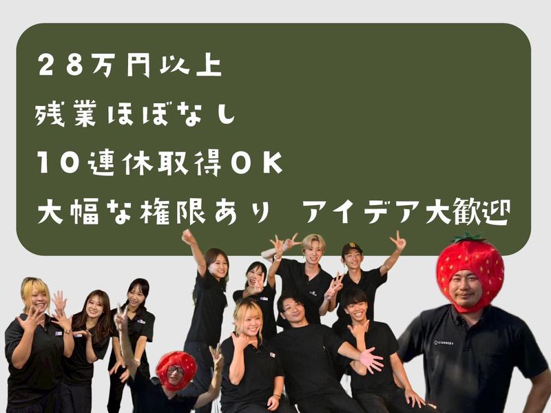 求めている人材 <20代〜50代まで幅広く活躍中> 経験よりも意欲や人柄を大切にします。 ・素直な方 要望や指導を素直に聞ける方。 人柄を重視した採用を行なっております。 ・ポジティブな方 これから成長していく会社なので、様々な業務が舞い込んできますが前向きに仕事に取り組める方。あなたの成長に合わせて報酬もUP致します! 大切な時間を使って仕事をするからこそ、ポジティブなメンバーと一緒に成長しましょう!一緒に不満を感じたり、嫌々働く環境とはさよならしませんか。 ・チームワークを大事にできる方 .*- 【スタンドケイってどんな会社??】 今から10年前、未来に希望を持ち、笑顔で溢れた人を一人でも増やしたい。そんな想いでSTANDKEYを立ち上げました。 BBQ場、いちご農業、メディア事業を運営しています。現在全国に20店舗、2026年度はさらに全国に10店舗OPENする予定の急成長中の当社。以下で会社の雰囲気や事業内容をご確認ください。 ◇スタンドケイ https://standkey.com/ ◇スタンドケイの雰囲気がわかる動画 https://www.youtube.com/watch?v=MaYNuBY1p6k \アピールポイント/ 【人と人が心で繋がる“場”を生み出し、日本文化の未来をつくる。】をビジョンに掲げています。 スタッフは優しく温かいメンバーばかりです。 他拠点スタッフとの交流は、定期的な社員の訪問はもちろんのこと、他店での研修や年一回の全社員が集まる社員総会などがあります。 是非スタンドケイの一員となって一緒に会社を成長させていきましょう! そして、あなたの「やりたい」ことを実現していきましょう!