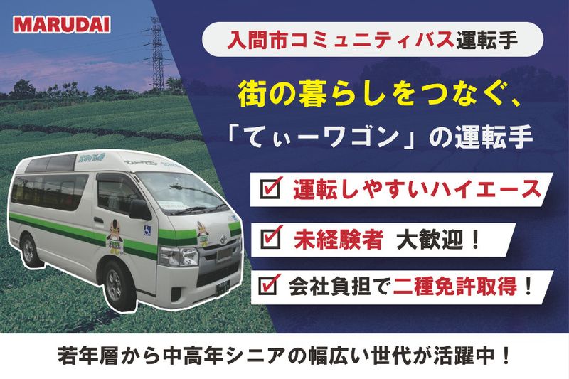 【仕事内容】 ■仕事内容 入間市運営のコミュニティバス(てぃーワゴン)の運転をしていただきます。 \てぃーワゴン運転手の働きやすさ/ ◇毎日同じルートで運行◇ 観光バスのような異なるルートはありません!一度覚えてしまえば楽々です! ◇運転しやすいハイエース◇ 大型車やバスを運転したことのない方でも運転しやすいハイエースです! もちろん入社後に制度を活用し、第二種免許の取得も可能! ◇近距離運転中心◇ 長距離の運転・高速道路の運転は少なく、近隣地域の運行のため、疲労も残りにくいです! ■活かせる資格・経験 ◇普通自動車二種免許◇ バス運転の経験はなくても、資格があればすぐに活躍することができます! ◇活かせる経験◇ ・スクールバス運転手 ・幼稚園バス運転手 ・路線バス運転手 ・送迎ドライバー ・バスドライバー ・タクシー運転手 ・配送ドライバー ・トラックドライバー ・病院/施設の送迎ドライバー ・スイミングバス運転手 ・教習所教官 ※普通自動車二種免許をお持ちでない場合も、入社後に取得可能! ■こんな方におすすめ ◇年齢・経験を気にせず働きたい方◇ ・若年層から中高年シニアの幅広い世代が活躍中! ・長距離運転や深夜運転がなく、疲労がたまりにくい! ◇好きなことに関わりたい方◇ ・車に関わり続けることができる! ・地域の方々の生活をサポートできる! ◇地元が好きな方◇ ・転勤なく、地元で働き続けることができる! ・決まった近隣エリアのみの運転で、地域に密着! ■先輩社員の入社経緯 ◇トラックドライバーから転職◇ 長距離トラックのドライバーとして働いていましたが、深夜の勤務など労働時間が体力的に難しく転職を考えていました。 今の仕事は、毎日決まった時間の日中業務になるので、とても安定して働くことができています。 ◇病院の送迎ドライバーから転職◇ 人と関わる運転がしたく、病院で送迎バスのドライバーをしていましたが、キャリアアップのために転職を検討していました。 普通自動車二種免許は持っていませんでしたが、入社後の資格取得制度で、取得が可能だと知り、入社を決めました。 ■現場に出るまでの流れ <普通自動車二種免許をお持ちの場合> ①座学研修(10時間) ②実車研修(20時間~) ③先任者同行のもと担当コースを試運行(4~8回) ※2~4週間を目処に運行スタートが可能です。 <普通自動車二種免許をお持ちでない場合> 入社後に当社全額支援で普通自動車自動車二種免許を取得いただきます。 (提携教習所で通学・合宿を選択可能) ※取得後の流れは既にお持ちの場合と同様です。 ■働きやすい環境づくり ◇賞与は年2回支給◇ ◇転勤なし◇ 転居を伴う(県をまたぐ)異動は一切ありません!入社時に希望の拠点をお伝えください。 ■安全への取り組み 命を預かる事業者として安全性の向上へ日々取り組んでおります! ◇最新設備の導入◇ 最新の安全技術、PCS、VSC装備車両を随時導入して 走行状態を検知して危険を抑止しています。 ◇健康チェック◇ ドライバーの睡眠時無呼吸症候群の可能性を事前にチェックして 安全運行に役立てています! =================== 創業101年 ~大正生まれの実績と伝統ある企業です~ 長い歴史と伝統がある当社ですが、新しい風も常に取り入れています! 安全への取り組みも積極的! 風通しの良い職場なので ぜひあなたの意見などもどんどん聞かせてください。 一緒に「より良い会社」にしていきましょう! =================== \まずはお気軽にご応募ください/ ご経験の活かし方や、ライフスタイルに合わせた働き方などまずはご相談ください! 少しでも気になったら、ご応募をお待ちしております!