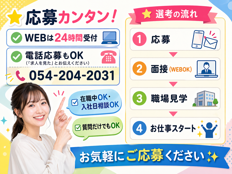 選考プロセス WEBまたは電話で応募OK! ✅WEBは24時間受付 ✅電話応募は「求人を見た」と お伝えください。 \ 選考はシンプル! / ① 応募 ② 面接(=登録) ※WEB面接可 ※履歴書(写真付)をご用意ください ③ 職場見学 ④ 就業スタート \ こんな方も安心 / ▶ 在職中の方も応募OK ▶ 面接日・入社日は相談OK ▶ 質問だけでもOK お気軽にご応募、 お問い合わせください✨ ================= 【当社(派遣元企業)について】 ================= 本求人は、富士テクノロジー株式会社による 人材派遣のお仕事です。 当社は、企業の業務サポートなどを手がけ 地域に根ざした実績を持つ会社です。 人材派遣部門では、ご希望やご経験を 丁寧に伺い、お一人おひとりに合った お仕事をご紹介しています。 派遣が初めての方もご安心ください。 お仕事開始前のヒアリングから入社手続き 就業後のフォローまで、 担当者がしっかりサポートいたします。 また、社会保険や有給休暇などの 福利厚生も整っており、 安心して働ける環境をご用意しています!