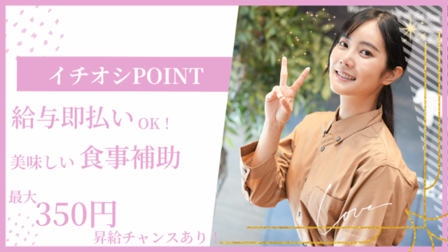 仕事情報 ● 仕事内容 ご来店いただいたお客様の接客をお願いします! ★お席へのご案内・お料理提供・バッシングなど! ★笑顔で元気なおもてなしをお願いします! アルバイト経験がない方・接客に自身がない方でも大丈夫! 未経験でもすぐに覚えられるので安心してくださいね☆彡 主婦/夫におススメな理由1 シフトは自己申告制で、2週間毎でシフトを提出できます。もち ろん平日だけでもOK!お子さんの急な体調不良などの場合は お気軽にご相談ください。上手く調節する事ができますよ。 残業もありません!もし発生したとしても1分ごとに時給が発生 するので損は絶対にさせませんのでご安心ください。 主婦/夫におススメな理由2 "時短勤務"OK!"扶養内勤務"OK! ・子供が通学してから帰ってくるまでの時間で働きたい ・子供の行事の時はお休みしたい ・家族が帰宅する少し前に帰って夕食の準備の時間が欲しい など、主婦/夫の方が働きやすい環境を作っています! 主婦/夫におススメな理由3 交通費支給・給与前払い制度・昇給のチャンスもあり! 短い時間でも高時給で効率よく働けるチャンスあり!! 昇給例・・・ ・全部でランクが7つあり、20円~最大350円まで時給UP! ・お友達紹介⇒入社したら謝礼金お支払い!(規定あり) 働くメリット ★ヘルプに行ってくれたら、ヘルプ先での時給は50円UP!! ★お給料は1分単位で支給!損させません! ★友達同士の応募がOK!お友達を紹介したら謝礼お支払い! ★シフト提出や連絡網はスマホでらくらく! ★髪型・髪色は自由なのであなたらしく!
