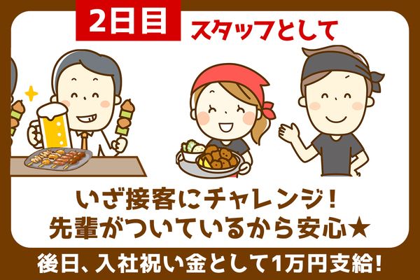 固定時間制 勤務時間 固定時間制 17:00~22:00の間で1日3時間~ ※土日どちらかの勤務が必須 ※週1日~勤務可! ※17:00より前の仕込みの時間帯で働きたい方もご相談ください! 「まずは週1日から始めて、 慣れてきたら勤務日数を増やしていく!」 「学業に慣れてきたから、 そろそろアルバイトを始めたい・・!」 など、ご希望の働き方をご相談くださいね◎
