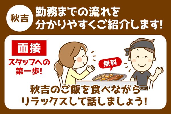 応募資格 ◎年齢不問 ◎高校生OK ◎学歴・資格・経験不問! ◎飲食未経験の方も大歓迎! ◎長期で働ける方歓迎 ◎土日祝に出勤できる方歓迎 ◎フリーター歓迎 ◎飲食バイトが初めての方はもちろん、 「アルバイトデビュー」の方も歓迎! ◎「昼は他のバイトがあるから、夜の時間帯に働きたい!」など、 Wワークをお探しの方にもピッタリ! \こんな方にピッタリ!/ ■「秋吉」が好き! ■人に喜ばれることが好き! ■バイトデビューしたい ■バイトを通して友達を増やしたい ■テスト期間など、学業と両立しながら働きたい ■授業が終わった後の夕方から働きたい ■人と関わることが好き ■食べ物が好き! ■人間関係のいい職場で働きたい ■いろいろな人とのコミュニケーションが好き