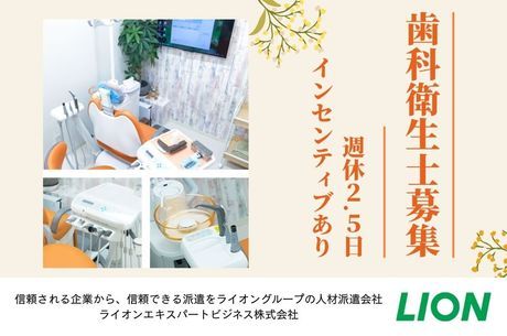 仕事内容 【お仕事の内容】 【歯科衛生士業務全般】 ・メンテナンス業務 DHのアポイントを治療とは別にとっていただき、クリーニング、メンテナンスを実施 ★研磨用ハンドピースはコードレスのアイプロフィを使用でPMTCを行います ・歯周基本治療 C処置とは別に並行して、DHのアポをとり、歯周治療を行っていただきます ・医院、Drマネジメント Drと協力して、患者の治療計画を作成したり、 手術スケジュールの管理など、治療の全体的な管理もお願いしています ・教育指導業務 経験豊富な方には、医院業務に課題があれば、医院の業務について課題抽出と立案し、 指導・教育を通して医院業務を円滑に改善をお願いしています(歯科医院勤務未経験の方は除外) ・医院運営業務 医院運営を円滑に進めるために必要な、在庫管理や発注業務、院内整備をお願いします 【お仕事のポイント】 歯科衛生士として予防処置から医院マネジメントまで、 幅広くご活躍いただける職場です。 メンテナンス業務では、専用アポイント枠を設け、 コードレスタイプのアイプロフィを用いたストレスのない快適なPMTCを実施。 歯周基本治療も治療計画に沿って歯科医師と連携しながら進めていただきます。 さらに、経験豊富な方には後輩DHやスタッフへの教育・指導業務、 治療スケジュールの管理、在庫発注・院内整備など、 医院全体の運営に関わる重要な役割もお任せします。 歯科衛生士として専門性を高めながら、キャリアアップを目指したい方に最適な環境です。 【営業のおすすめポイント】 東京都内で3院を展開する安定した歯科法人グループでの募集です。 まずは【時給支給の体験勤務】からスタートできるため、 職場の雰囲気を実際に確認してから安心して就業できます。 勤務は平日8時間、日祝は6時間半と働きやすく、残業ほぼなし・月10日休みのシフト制で プライベートも充実。スタッフ数が多いため医院全体に休診日はなくても、 しっかりお休みを確保できます。 また、自費診療が成約するとインセンティブも支給され、 やりがいを感じながら働ける環境です。 土日休み・平日休み両方希望の方にも対応可能で、 柔軟な働き方を希望される方にもぴったりの職場です。 【紹介予定派遣について】 紹介予定派遣とは、派遣社員として一定期間働いた後 (最長6ヶ月)双方の合意があれば派遣先に 直接雇用されることを前提とした派遣形態のことを指します。 実際に働いてみて、派遣先の雰囲気や仕事内容を確認し その上で直接雇用を決めることができます。 ~紹介予定派遣の流れ~ 1.派遣会社に登録・面談 労働者は派遣会社に登録し、スキルや希望条件を伝える。 2.派遣先企業とのマッチング 派遣会社が適性のある派遣先を紹介、 または労働者が希望とする派遣先のマッチングを行う。 3.派遣期間 派遣社員として一定期間(通常3~6ヶ月間)働く 4.直接雇用の判断 派遣期間が終了する際に 就職先と労働者の双方が合意すれば、 直接雇用(正社員/契約社員/パートなど)に移行します。 【ライオングループの専門性を活かして派遣が初めての方も安心してスタートができる!】 ライオン株式会社のグループ会社として、安心・安定した環境をご提供しています。 オーラルケアや衛生管理に強みを持つライオンならではの知見を活かし、 歯科衛生士・歯科技工士の方々に向けた専門性の高い人材派遣・紹介サービスを展開。 臨床だけでなく、企業での活躍を目指す方にも多数の紹介実績があり、 就業前後の丁寧なフォロー体制で、企業と働く人の双方に寄り添います。 オンライン面談やLINEでのサポート体制も整っており、派遣登録から就業まで安心してご相談いただけます。 あなたに合った、質の高い働き方を、ライオングループがしっかりサポートします。